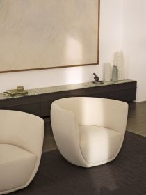 Der Softnoons-Sessel besticht durch seine weiche Silhouette und elegante Rundungen, die ihm einen einladenden und gemütlichen Charakter verleihen. Besonders der innere Rückenbereich sorgt für hohen Komfort, selbst ohne zusätzliches Kissen. Die durchgehende Linie, die sich harmonisch von den Armlehnen bis zur Basis zieht, verleiht dem Sessel eine skulpturale, ausgewogene und ästhetisch raffinierte Erscheinung.