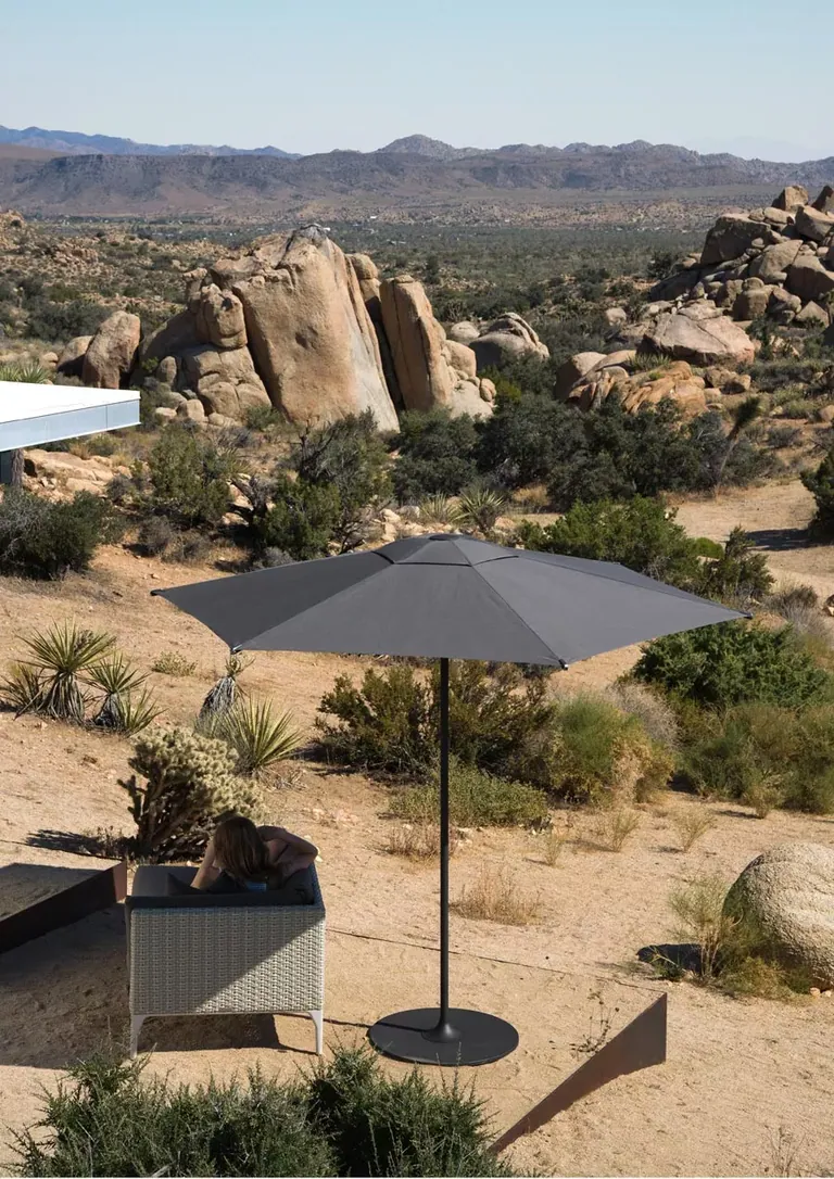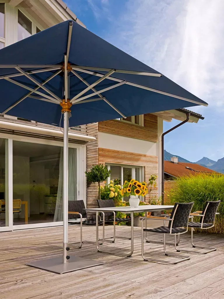 Dunkle Sonnenschirme: Ideal für klassische, elegante Gärten oder Terrassen. Sie bilden einen stilvollen Kontrast zu hellen Möbeln und Umgebungen.