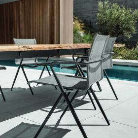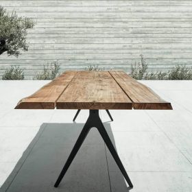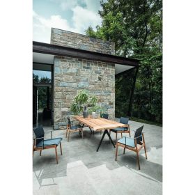 Die RAW Esstische von Gloster sind eine Hommage an echtes Material: Eine massive, 50 mm starke Teakholzplatte bleibt bewusst „raw“ und zeigt die natürliche Zeichnung, Struktur und Unregelmäßigkeit jedes einzelnen Baums. Getragen wird die Platte von einem klaren, modernen Gestell aus pulverbeschichtetem Aluminium. Natürliche Risse/Checks werden konstruktiv mit einem Messing-„Butterfly“-Insert verstärkt – damit der Charakter des Holzes sichtbar bleibt und zugleich dauerhaft stabil ist.