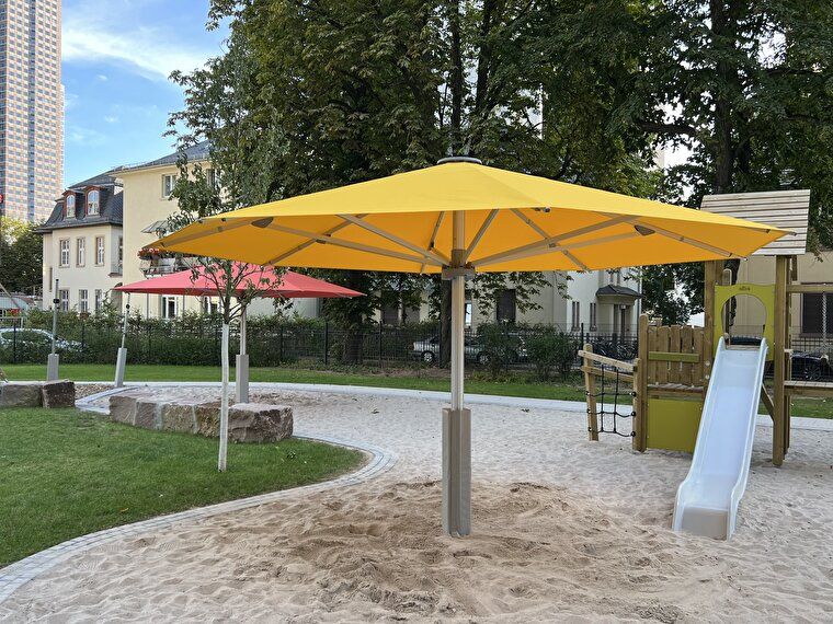 Schirmbezug: Nachspannbar durch stufenlos verstellbarer Strebenverlängerung, erhältlich in der Stoffklasse 5 (100 % Polyacryl ca. 300 g/m²)
