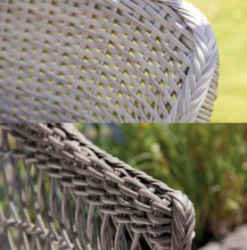 Das Polyrattan Geflecht der Grace Kollektion besteht aus einem Kunststoff, dass absolut resistent gegen Witterungseinflüsse ist und im Laufe der Zeit farbbestängig bleibt. Es ist handgflochten und hat eine Oberfläche, die sich ganz gut anfühlt und sehr natürlich aussieht.