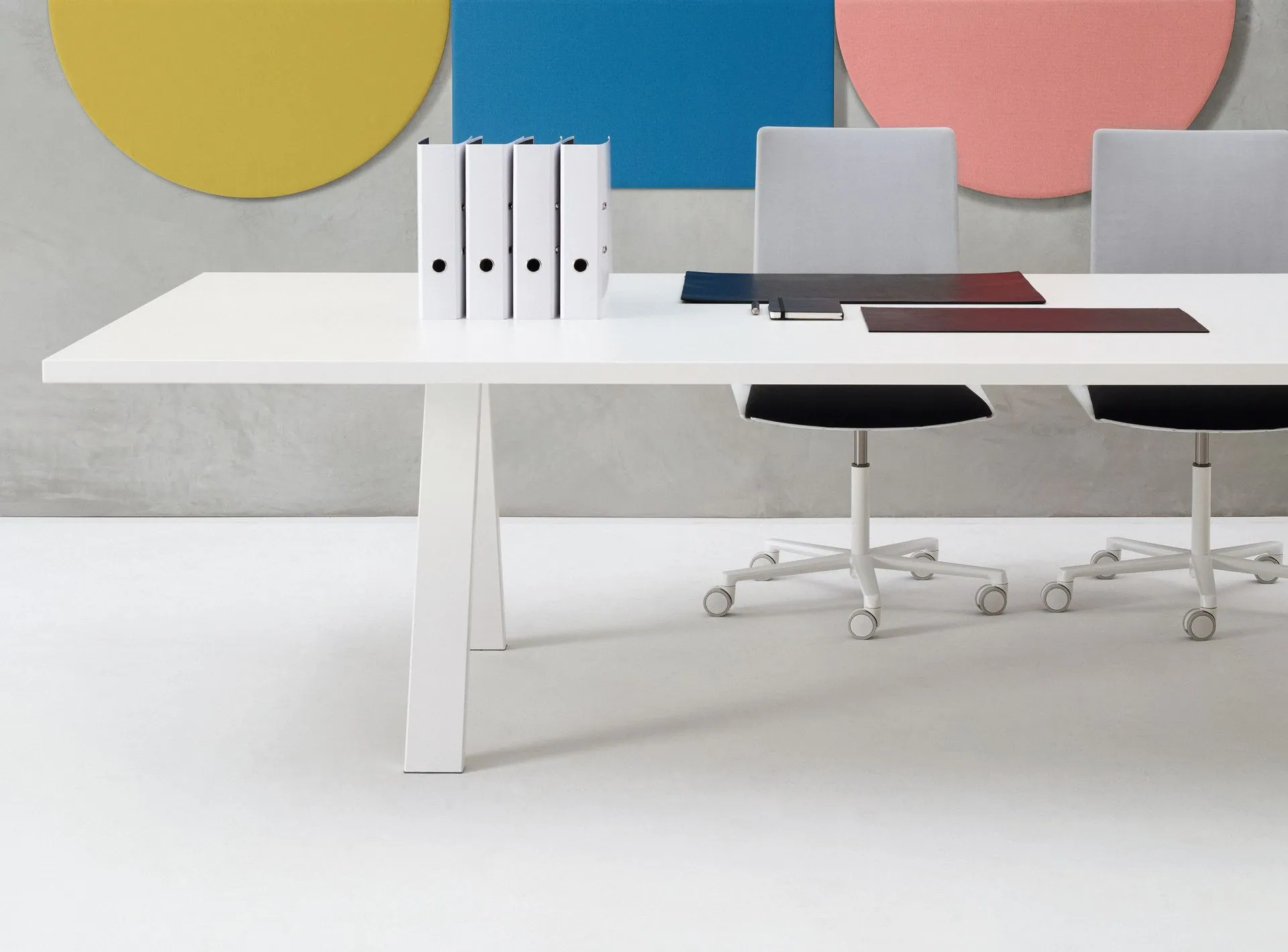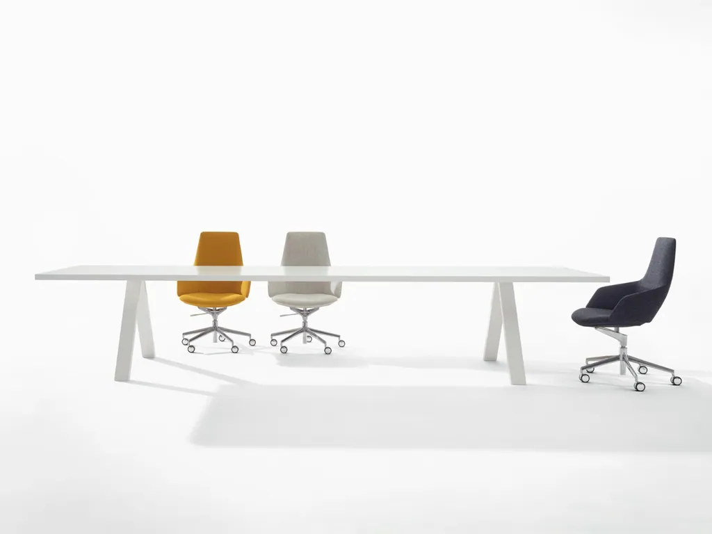 Cross ist die Tischkollektion für klare, professionelle Settings: Meetingräume, Boardrooms, Projektflächen. Entworfen von Metrica (2014), verbindet Cross eine reduzierte Optik mit einem starken konstruktiven Ausdruck – typisch sind die prägnanten Gestelllösungen, die große Plattenformate elegant tragen. Durch viele Größen und Ausführungen lässt sich Cross präzise in Architektur- und Materialkonzepte integrieren. Das Ergebnis ist ein Tisch, der Präsenz zeigt, ohne schwer zu wirken: ideal für Räume, in denen Entscheidungen getroffen werden – und in denen Design Ruhe, Ordnung und Qualität ausstrahlen soll.