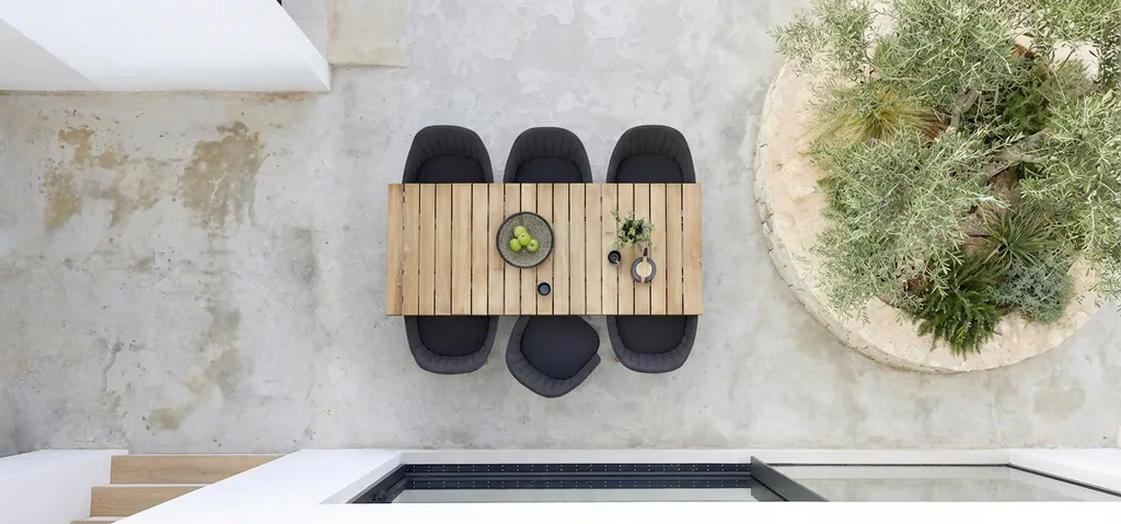 Konische Aluminiumsbeine, die sich nach unten hin verjüngen und die breiten und weich abgerundeten Lamellen aus Teak tragen. Die Zusammensetzung der Materialien verleiht der Core-Garnitur einen warmen und leichten Ausdruck, während das Design gleichzeitig solide erscheint. Das Gestell ist aus speziell gestalteten Profilen hergestellt, die eine kräftige Konstruktion und einen eleganten Eindruck erzeugen. Teak ist eine ölhaltige Holzart, die sich optimal für den Gebrauch im Freien eignet. Das Holz patiniert im Laufe der Jahre auf natürliche Weise zu einer kühlen, silbergrauen Farbe. Durch die Verwendung von Teaköl kann es aber auch seinen warmen natürlichen Farbton behalten. Die Stühle der Core-Serie wurden aus wetterbeständigem Cane-line SoftTouch® (Grau oder Braun) mit einer Polsterung aus schnell trocknendem Schaumstoff hergestellt. Die gepolsterten Stühle sind äußerst komfortabel, während Details an den Armlehnen das spezielle Design dahinter verraten. Der Stuhl ist stabelbar und wurde für die Tischserie entworfen, wobei durchaus auch andere Stühle den stilgerechten Tisch ergänzen können.