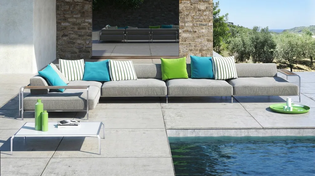 Brushed stainless steel frame. Cushion padding in dryfeel polyurethane. Removable outdoor fabric cover, available in different colours. Laminate, corian or marble table top.