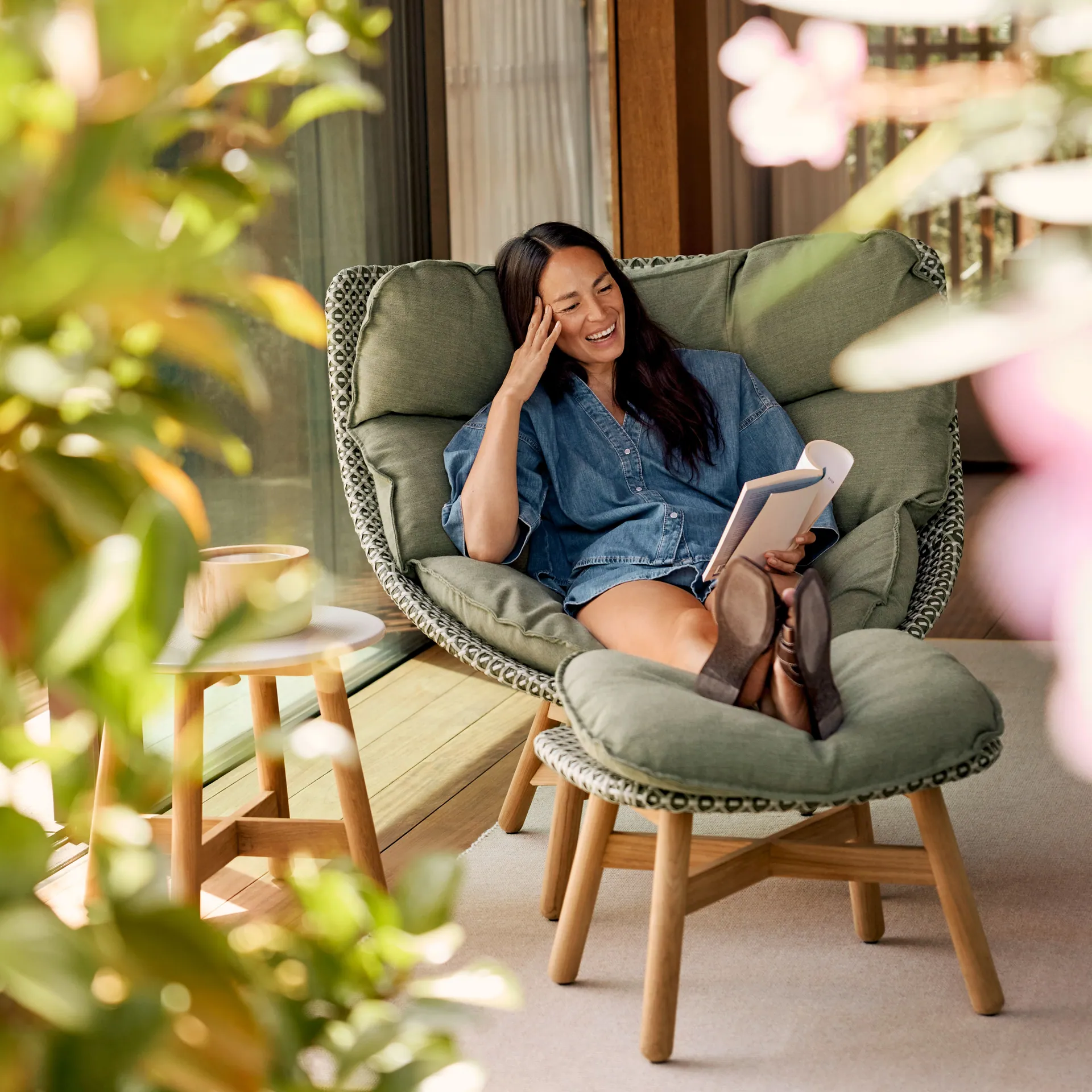 Die DEDON MBRACE Kollektion (Design: Sebastian Herkner) kombiniert handgeflochtene DEDON-Faser mit warmem Teakholz – alternativ auch mit einem eleganten Aluminiumguss-Gestell. Inspiriert von der Geste einer „Umarmung“ schmiegt sich die organische Form an den Körper und wirkt zugleich modern und einladend – für entspannte Lounge- und Dining-Momente im Outdoor-Bereich. Die DEDON MBRACE Kollektion ist seit vielen Jahren unter den Bestsellern in unserem Sortiment.