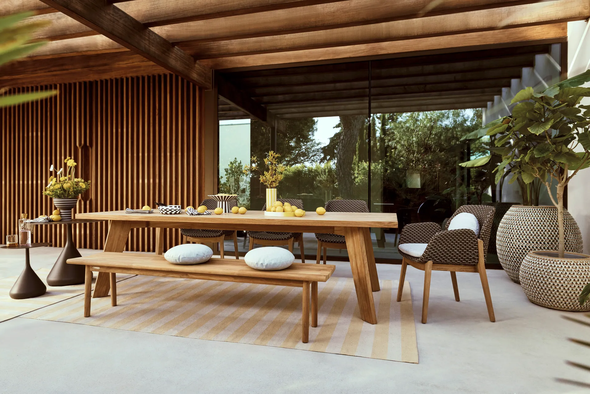 • Präzision aus Teak: Das Untergestell aus massivem, zertifiziertem Teakholz wird mittels modernster CNC-Technik gefertigt. Ein besonderes Designmerkmal ist der markante, schlanke Spalt zwischen Sitz und Rückenlehne, der dem Stuhl seine Leichtigkeit verleiht.Nachhaltigkeit: DEDON EcoCycle FiberLuxus und ökologische Verantwortung gehen bei CALADIO Hand in Hand. Die verwendete EcoCycle Fiber ist eine bio-basierte Faser, die zu 90 % aus erneuerbaren pflanzlichen Ressourcen (Zuckerrohr-Ethanol) gewonnen wird. Sie bietet die gewohnte DEDON-Widerstandsfähigkeit und Haptik, reduziert jedoch aktiv den CO2-Fußabdruck – für ein exquisites Wohlbefinden mit gutem Gewissen.Zielgruppe & Sales Strategy: Das ultimative Dining-SetCALADIO richtet sich an den anspruchsvollen BARCELONA-Kunden, der höchste Ansprüche an Ergonomie und Ästhetik stellt. Ob auf dem großzügigen Balkon, der Sonnenterrasse oder im Garten – dieser Stuhl ist auch ohne Kissen (Dry+ Kissen inklusive) ein ergonomisches Meisterwerk.Unsere Empfehlung für Ihr Zuhause: Kombinieren Sie den CALADIO Armlehnstuhl mit dem massiven SOLYD Dining Tisch. Wir empfehlen ein Setting von 4 bis 6 Stühlen, um die architektonische Kraft des Teakholzes mit der organischen Wärme des CALADIO-Geflechts in Einklang zu bringen