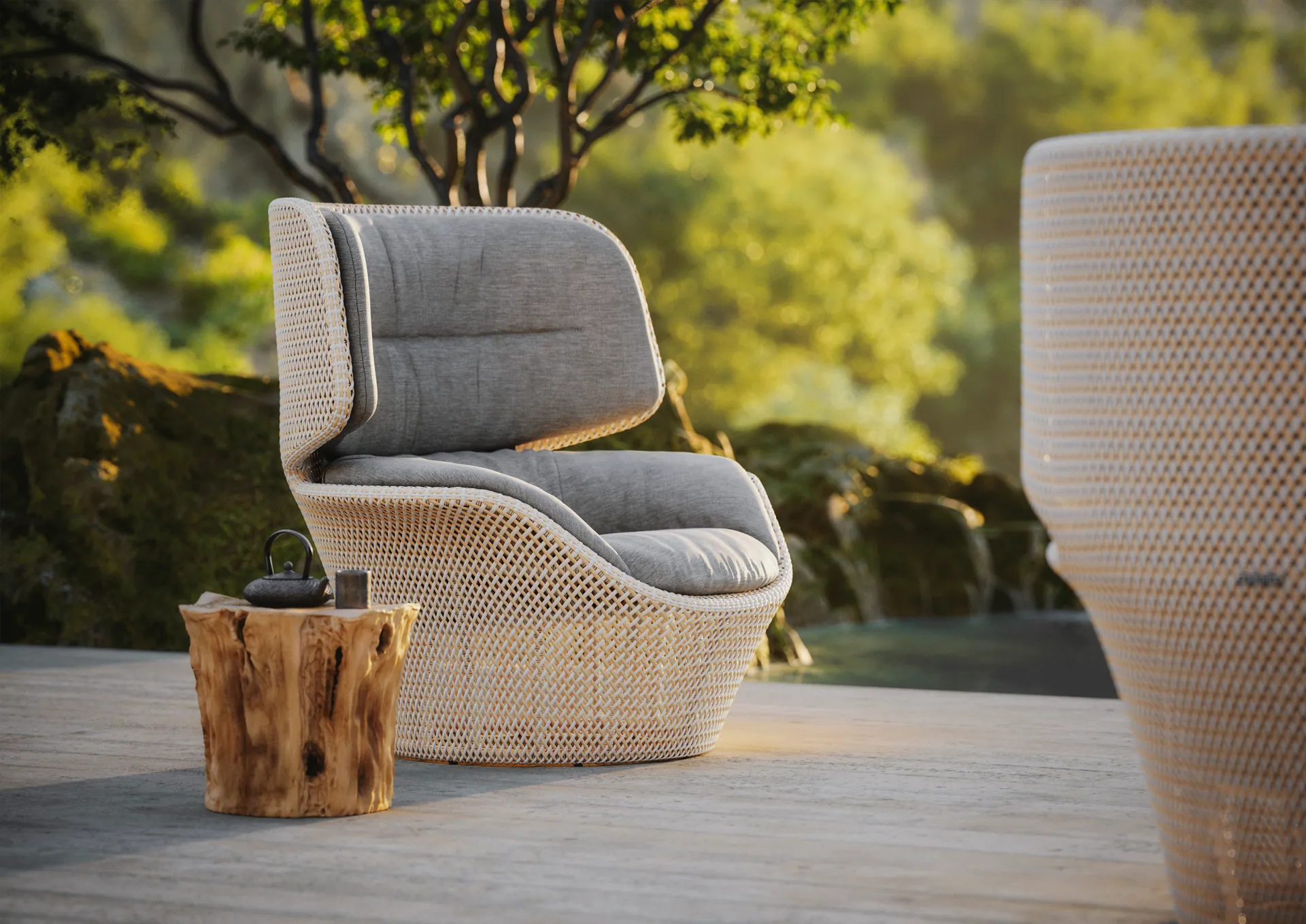 Mit SEASHELL GRAND eröffnet Jean-Marie Massaud ein neues Kapitel der ikonischen SEASHELL-Serie – inspiriert von der schützenden, „umarmenden“ Form einer Muschel. Der Hochlehner mit hoher Rückenlehne und sanft abfallenden Armlehnen vermittelt Geborgenheit wie in einer maßgeschneiderten Schale. Handwerklich prägnant ist die elegante Oberflächentextur aus der Verflechtung zweier verschiedenfarbiger DEDON EcoCycle Fasern. Erhältlich in fein abgestimmten Farbstimmungen wie Midnight und Oasis – für „barefoot luxury“ mit ruhiger Präsenz.