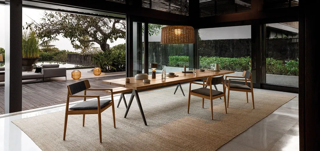 Im Zentrum steht der Raw Dining Table von Henrik Pedersen: Eine 50 mm starke „raw“ Teak-Platte (Natural oder Buffed Finish) trifft auf ein pulverbeschichtetes Aluminiumgestell. Die Kante ist wahlweise als Contour Cut oder als Sap Wood Edge ausgeführt – und natürliche Risse/Checks werden mit einem Messing-„Butterfly“-Insert stabilisiert, damit der Charakter des Holzes bleibt, ohne an Halt zu verlieren.