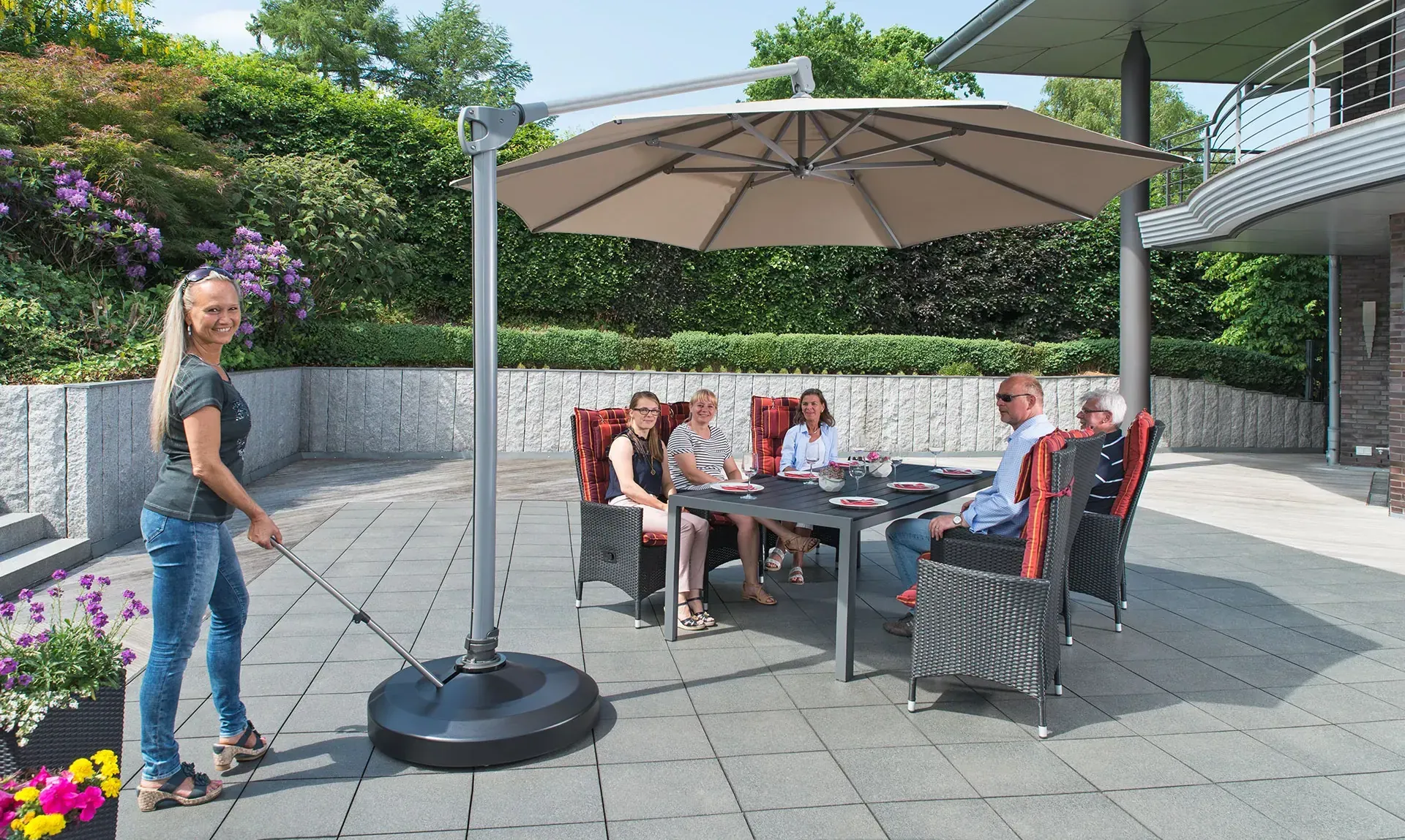 Mit dem LiRo Maxi erwerben Sie einen hochwertigen Sonnenschirm-Ständer, dessen patentierte, weltweit einzigartige Konstruktion es Ihnen ermöglicht, den eingesetzten Sonnenschirm in aufrechter Körperhaltung an jede beliebige Stelle auf Ihrer Terrasse zu verfahren. Die Variable 4- und 5 Loch-Flanschbefestigung erlaubt die Befestigung von unterschiedlich großen 4- und 5-Loch-Flanschverbindungen. So können Sie Sonnenschirme und Ampelschirme endlich da aufstellen, wo er auch wirklich benötigt wird. Edles Design und kompakte Abmessungen - Der LiRo ist nicht nur praktisch, sondern auch ein besonderer Blickfang, der perfekt zu hochwertigen Outdoormöbeln passt und sich in jedes Ambiente harmonisch einfügt. Um einen sicheren Stand zu gewährleisten, dürfen nur Sonnenschirme eingesetzt werden, die gemäß den Angaben des Sonnenschirmherstellers keine höheren Gewichte erfordern als das Ständergewicht.
