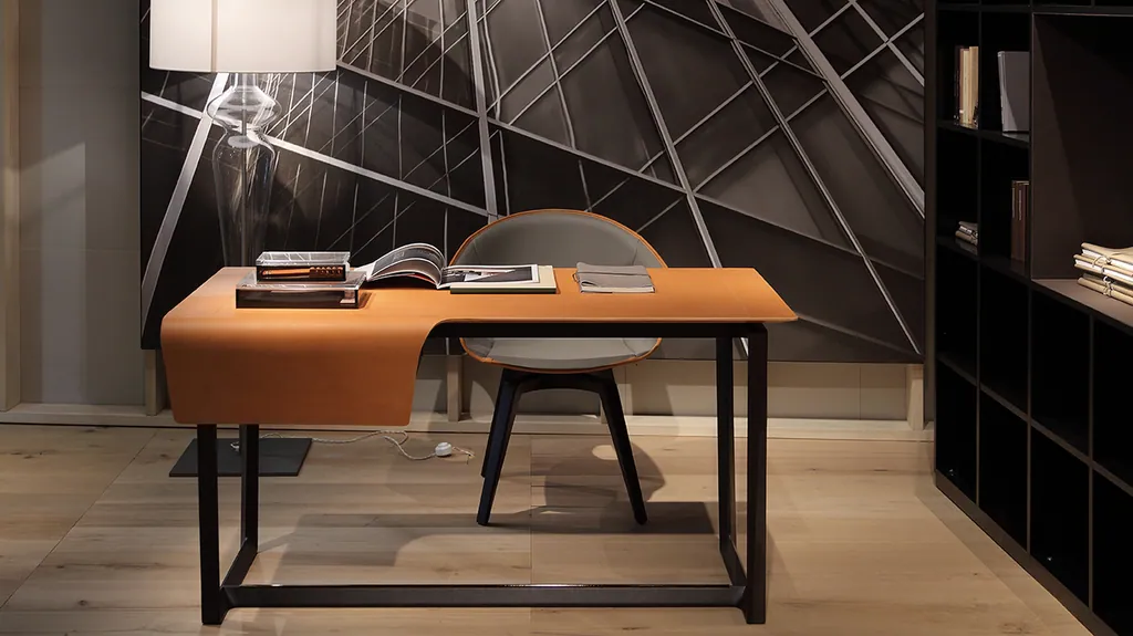 Das Design des Schreibtisches Fred vereint leicht wirkende und fast schwebende geometrische Formen. Roberto Lazzeroni hat ein Möbelstück geschaffen, bei dem die ästhetische Anziehungskraft einer nahtlosen Lederfläche durch subtile Kaltgravuren und -prägungen hervorgehoben wird, die elegante grafische Verzierungen erzeugen. Ein spezielles handwerkliches Verfahren ermöglicht die Frontbiegung des Leders ohne die Notwendigkeit innerer Stützstrukturen. Der Stuhl Ginger wurde als idealer Begleiter für den Schreibtisch Fred konzipiert und vervollständigt den Arbeitsbereich im Haus, indem er ihm Vollständigkeit und Harmonie verleiht.