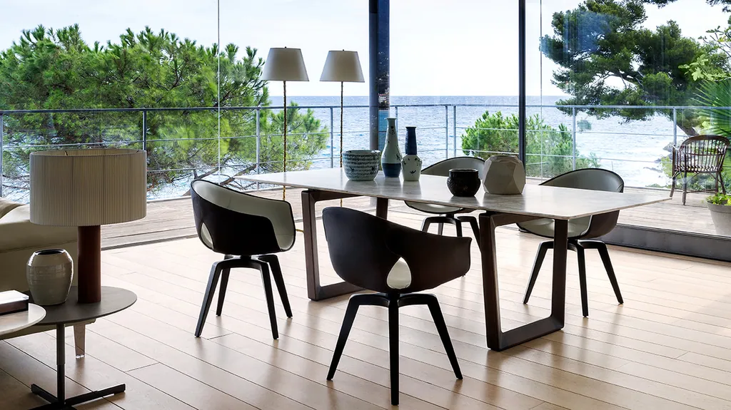 Die Ginger-Sesselstruktur besteht aus formgegossenem thermoplastischem Verbundpolymer, während die Sitzpolsterung aus Polyurethanschaum besteht. Der Bezug ist in verschiedenen Optionen erhältlich: Eine Kombination aus Cuoio Saddle Extra-Leder für den äußeren Teil und Pelle Frau®-Leder für den inneren Teil.Vollständig in Pelle Frau®-Leder bezogen.Vollständig mit Stoff von Kvadrat by Poltrona Frau bezogen. Das Gestell des Ginger-Sessels besteht aus massivem Eschenholz mit einem schwarz lackierten Stahlrahmen. Der Sessel ist in festen und drehbaren Ausführungen erhältlich und verfügt über eine automatische Rückkehrfunktion, die es ermöglicht, den Sessel um 360° zu drehen und in seine Ausgangsposition zurückzukehren. Die Fußausführungen sind in Esche in den Farben Moka oder Wengé erhältlich, und auf Anfrage sind individuelle Lackierungen nach RAL oder Muster möglich.Der Ginger-Sessel, der 2011 von Roberto Lazzeroni zusammen mit dem Schreibtisch Fred entworfen wurde, erfreute sich von Anfang an großer Beliebtheit und ist auch heute noch der meistverkaufte Stuhl in der Poltrona Frau-Kollektion. Seine klaren und schlichten Linien sind von raffinierter Eleganz geprägt. Die Lederschale strahlt Einladung und Schutz aus, während der Sitz äußerst komfortabel ist. Die Formen sind sowohl geschwungen als auch grafisch, was eine harmonische Verbindung zwischen der Schale und der Basis schafft. Ob als natürliche Ergänzung zum Schreibtisch Fred oder als eigenständiger Sessel, die drehbare Version eignet sich perfekt für den Arbeitsbereich, während die feste Version ideal für den Wohnbereich ist.