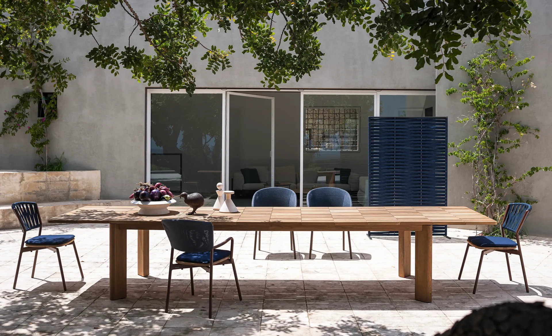 Die unten abgebildete RODA BRICK Kollektion stellt das Material Holz in den Mittelpunkt – als ausziehbaren Outdoor-Esstisch, dessen Platte aus Teak-Elementen wie „Ziegel“ aufgebaut ist: Ein rhythmisches Raster aus geometrisch präzisen Fugen prägt die gesamte Optik und macht die Oberfläche unverwechselbar. Die klare, stabile Unterkonstruktion setzt dazu einen bewusst reduzierten Kontrast und betont die grafische Wirkung der Tischplatte. Für mehr Flexibilität sorgt ein Butterfly-Auszugssystem, das die Einlegeplatten unsichtbar unter der Tischplatte verstaut und den Tisch im Handumdrehen verlängert. RODA weist darauf hin, dass sich bei direkter Witterung durch die komplexe Konstruktion leichte, natürliche Bewegungen im Holz zeigen können – empfohlen wird daher eine Platzierung in überdachten Bereichen wie Veranden. Der BRICK Ausziehtisch wurde außerdem 2016 beim XXIV Compasso d’Oro mit einer Ehrenauszeichnung gewürdigt.