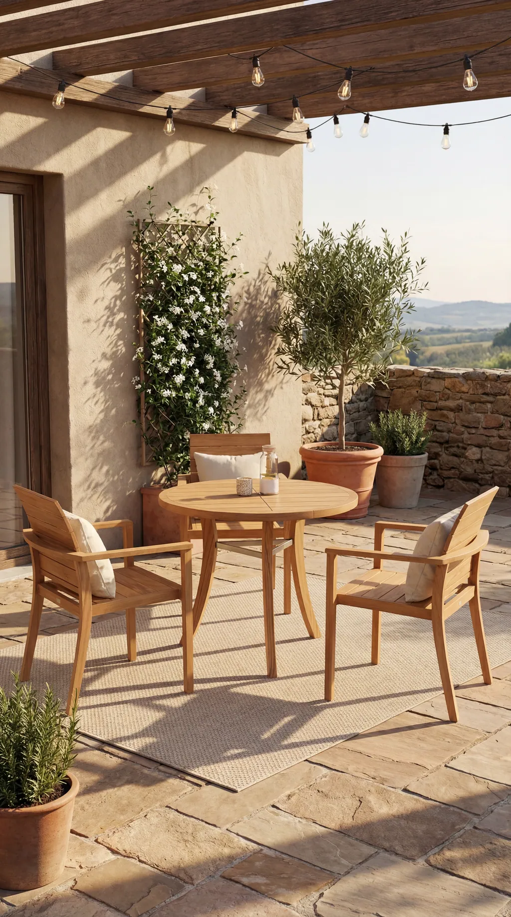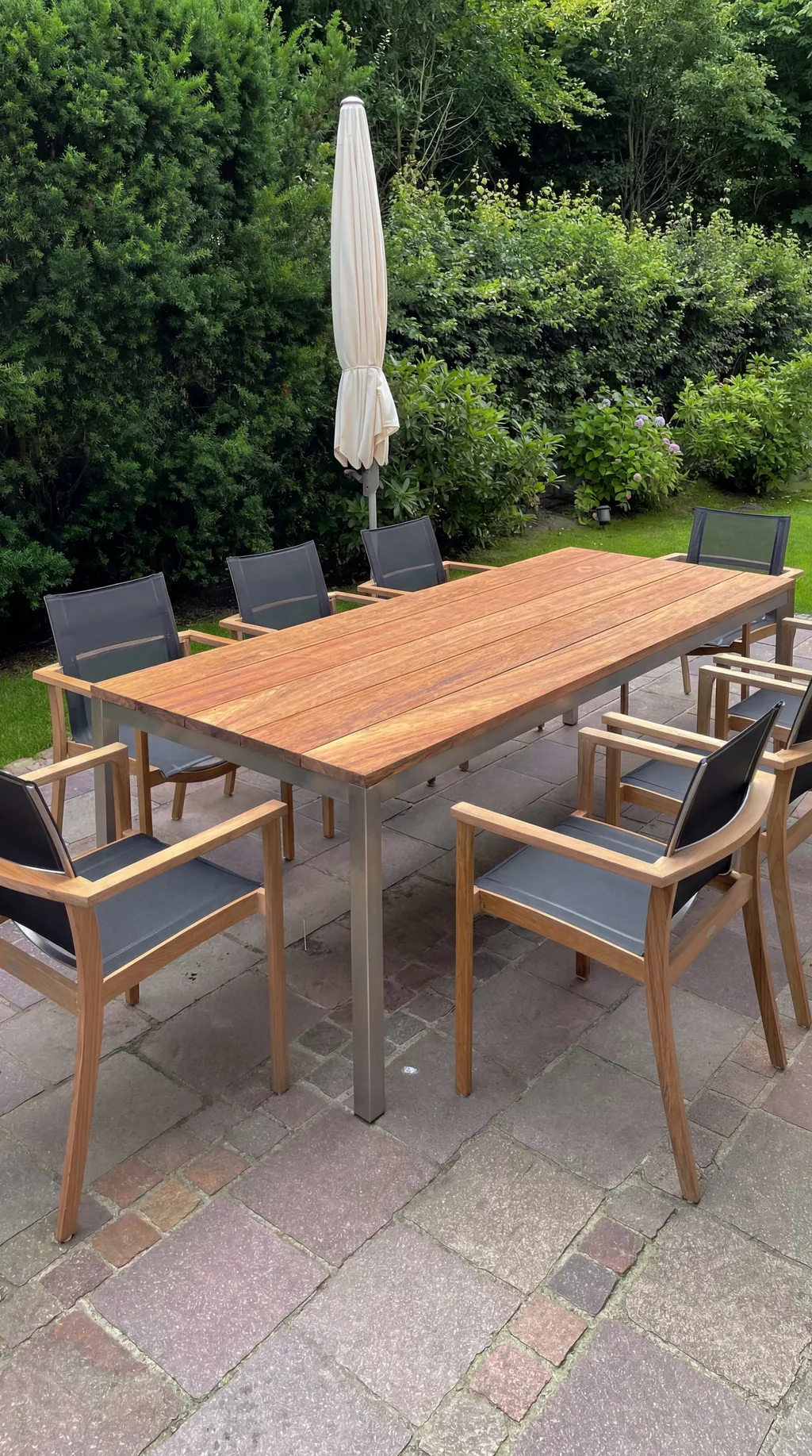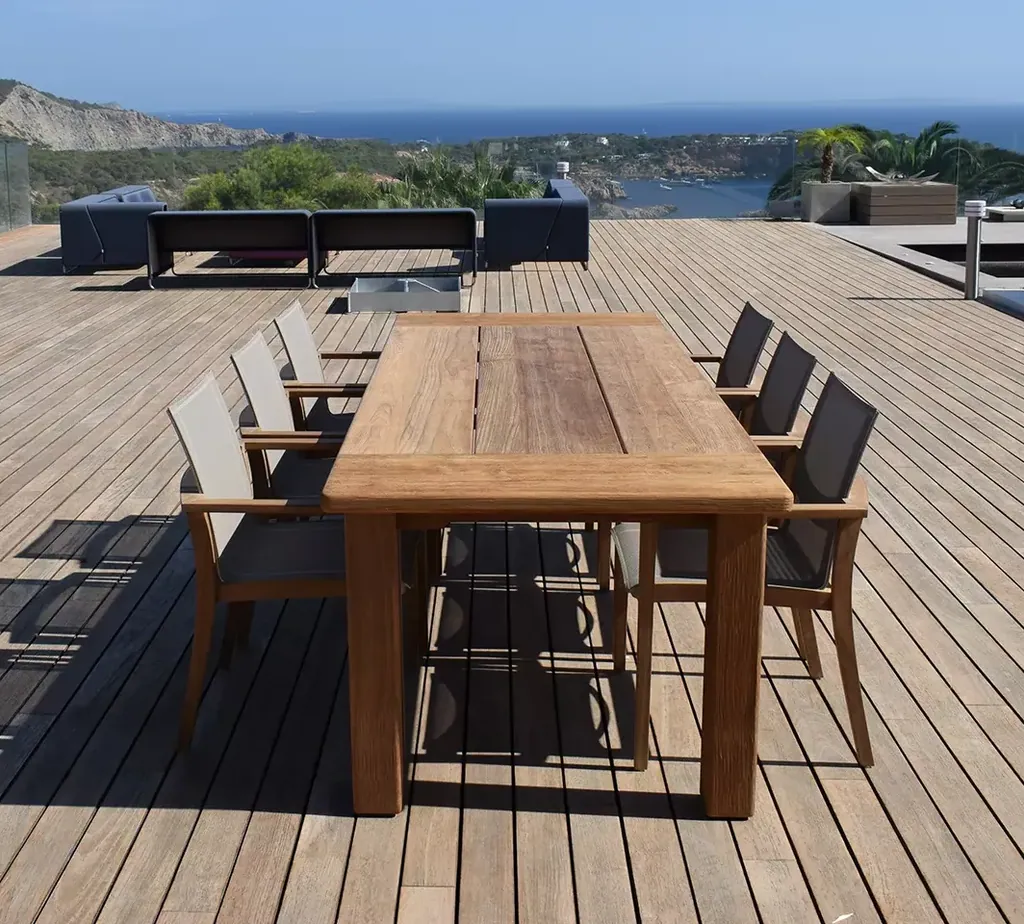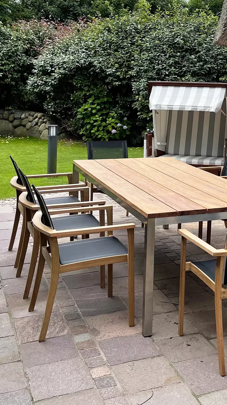 Was Royal Mirage auszeichnet, ist die konsequente Auswahl erstklassiger Materialien. Teakholz der Güteklasse A stammt aus nachhaltigem Anbau und zeichnet sich durch seine natürliche Resistenz gegen Witterung und Schädlinge aus. Ohne spezielle Pflegemittel bleibt es über Jahre hinweg formstabil und schön – ob in der ursprünglichen Honigfarbe oder mit der charakteristischen silbergrauen Patina, die Teak im Laufe der Zeit entwickelt. Die durchdachten Details wie stufenlos verstellbare Gasdruckfedern bei den Sonnenliegen zeigen den hohen Anspruch an Funktionalität und Benutzerkomfort.