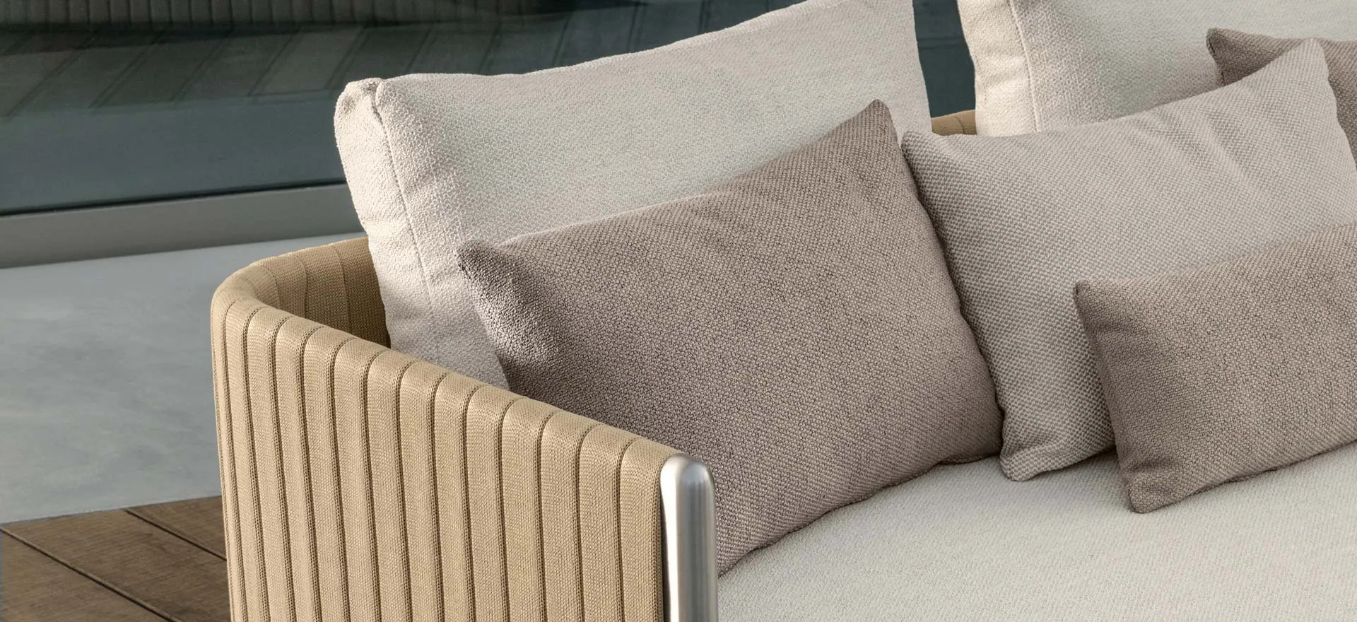 Das modulare Sofa der Talenti George Kollektion stellt das führende Produkt dieser neuen Talenti Gartenmöbel-Kollektion dar. Die Leichtigkeit der Linien und der Komfort der Sitzflächen stehen im Kontrast zur Stärke und Langlebigkeit der Edelstahlstützen der Struktur, die durch die leicht gepolsterten synthetischen Seile, die die Rückenlehne bedecken, sichtbar bleiben. Die mehreren Kombinationsmöglichkeiten, die das George modulare Sofa bietet, die sorgfältig ausgewählten Stoffe und die Kissen mit abnehmbaren und wetterbeständigen Bezügen machen dieses Sofa zum perfekten Produkt für Ihren Außenbereich.