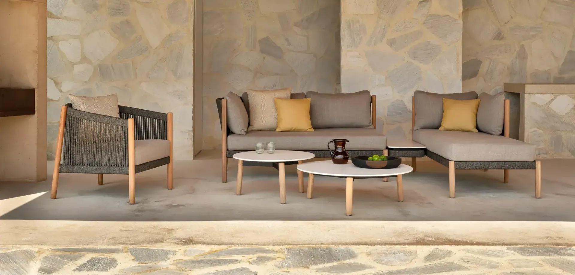 Die Outdoor-Möbel der Lento-Kollektion zeichnen sich durch einen Mix aus natürlichem Teakholz, wetterfestem Polypropylenseil und komfortbalen Kissen aus. Das Gesamtbild ist modern und zurücknehmend, das anthrazitfarbene Seil und das warme Teakholz passen perfekt zu den Lento Couch- und Beistelltischen. Die Tische sind mit einer hellen Keramikplatte ausgestattet, die von venezianischen Terrazzokacheln inspiriert ist und ein großzügiges Raumgefühl. Lassen Sie sich in den bequemen Stühlen und Outdoor-Sofas nieder und entspannen Sie sich in Ihrer eigenen Wohlfühloase.