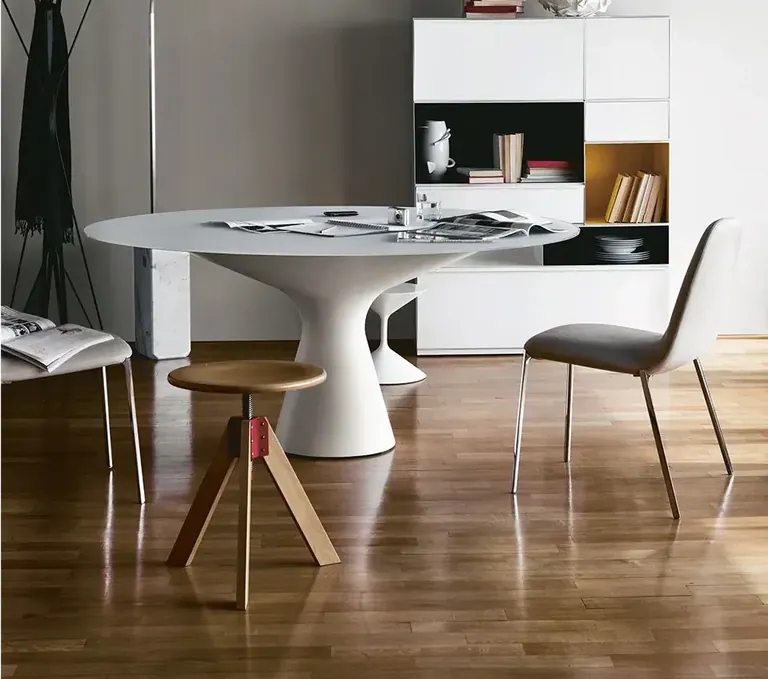 Ein weiterer großer Klassiker, entworfen von De Pas D’Urbino Lomazzi mit effektiver Einfachheit, beginnend mit jenen Hockern, die wir so oft in Architekturstudios gesehen haben. Eine Struktur aus drei natur lackierten Buchenholzbeinen, die durch eine in Rot lackierte Halterung miteinander verbunden sind, die bewusst hervorgehoben ist, genauso wie die gut sichtbare Gewindestange, die den runden Sitz stützt und eine einfache vertikale Einstellung ermöglicht.