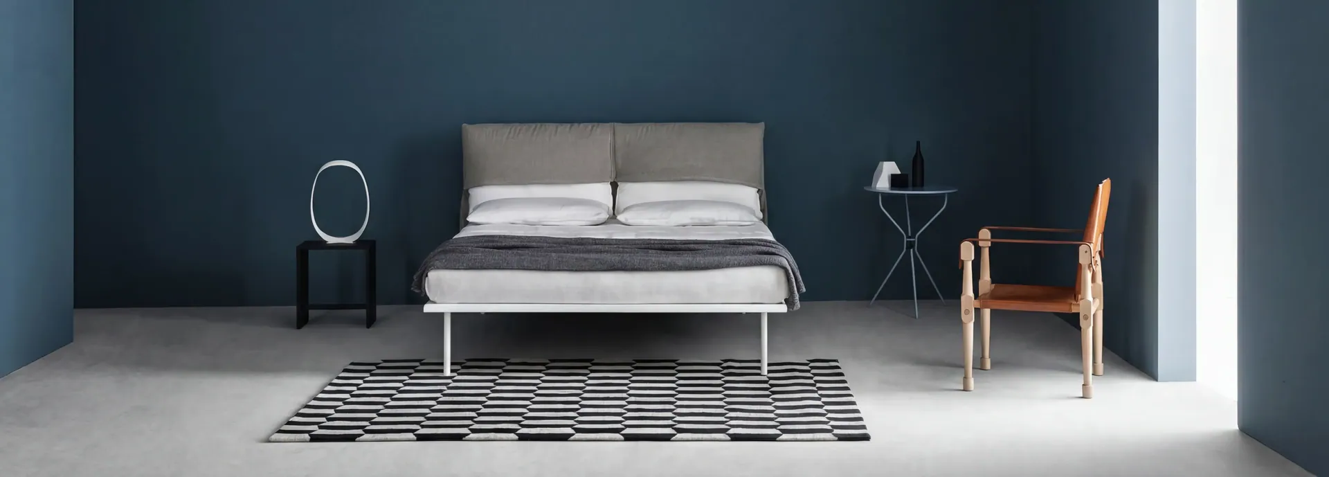 Eine neue Idee für die Nacht mit einem minimalen Metallrahmen und weichen Kissen für das Kopfteil, die typische Kissen eines bequemen Sofas nachahmen. Ein Bett mit modernem, minimalem Design: feiner Metallrahmen und zwei weiche Kissen, die das Kopfteil bilden. "Das Designprojekt konzentrierte sich darauf, ein Bett zu schaffen, das den Komfort eines Sofas zum Lesen, Fernsehen usw. bietet. Die Idee der Rückenkissen, die für Sofas typisch sind, wurde auf das Bett übertragen, wobei sie in diesem Fall als Kopfteil verwendet wurden. Auch praktisch gesehen sollte das Bett gepolsterte Teile mit abnehmbaren Bezügen haben, die leicht zum Waschen entfernt werden können, ohne komplizierte Manöver. Dies ist eine wichtige Eigenschaft für Reinigungszwecke und nicht zuletzt, um die Ästhetik durch den Kauf von zwei Kissenbezügen, auch in einer anderen Farbe, zu verändern." Dies sind die Prämissen von Emaf Progettis neuem Schlafkonzept, das mit den neuesten Trends in der multifunktionalen Entspannung verbunden ist. Kopfteil-Kissen mit Polsterung aus 100% reinen Gänsefedern. Abnehmbarer Stahlrahmen, lackiert in Schwarz oder Weiß. Federung mit gebogenen Buchenholzleisten und einstellbarer Steifigkeit. Nyx ist auch in der Version ohne Kopfteil-Kissen erhältlich.