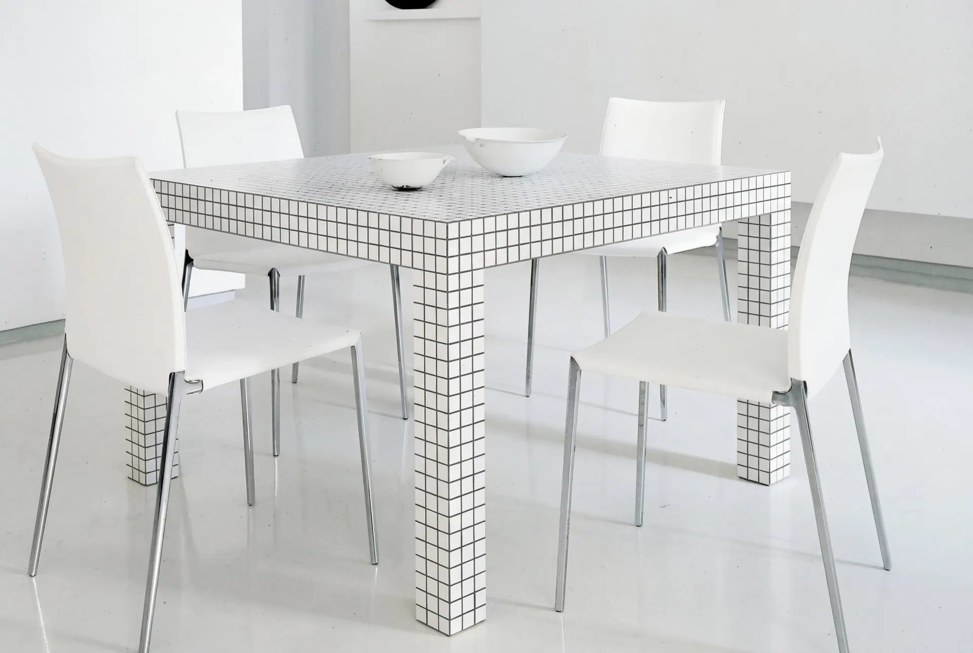 Eine Familie einzigartiger und zeitloser Möbel entsteht, eine Ikone basierend auf regelmäßigen geometrischen Formen, die mit quadratischem weißen Laminat (speziell von Abet Print entworfen, von Superstudio gestaltet und Misura genannt) bedeckt sind und durch klare, einfache und perfekte Volumen gekennzeichnet sind. Eine wahre "künstliche Landschaft", die sich nach Belieben erweitern lässt, neutral und gleichzeitig stark: Eine einzelne quadratische "Tischplatte mit Beinen", die sowohl zu einem Tisch und Raum wird als auch zu einem Stuhl, Bett, einer Bank, einem Schrank und einem Hocker.