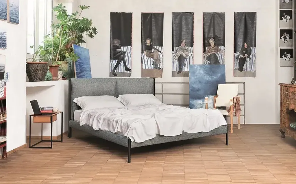 Aus den Erinnerungen heraus wieder beginnend: Zurückdenken an die einfachen, authentischen, notwendigen Dinge. Ein intimes Objekt, die Reinheit einer lebhaften Erinnerung, des Alltags, schlicht und authentisch. Ein Bett mit einer schlichten Struktur und makellosen Details, das die Intimität des Lebens beschreibt. Das gepolsterte Kopfteil bietet Komfort beim Lesen, die horizontale Stange und die Füße bestehen aus matt schwarz lackiertem Metall und fügen sich sanft in das natürliche oder schwarz gebeizte Eschenholz der vertikalen Stützen ein, während die Struktur mit Stoff bezogen ist. Die Suche nach Empathie und Vertrauen zwischen dem Objekt und denjenigen, die es nutzen, führt zurück in eine Zeit, als Dinge gemacht wurden, um lange zu halten und die Schönheit des Lebens über die Jahre zu begleiten.