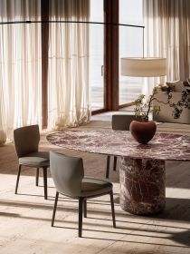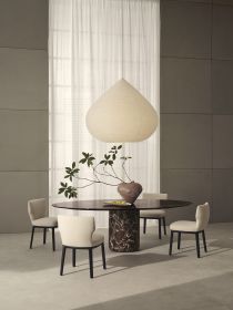 Der gepolsterte Stuhl Ami, entworfen von Yabu Pushelberg, interpretiert den charakteristischen französischen Clubsessel der 1920er Jahre auf zeitgemäße Weise neu. Mit seiner weich gerundeten Formensprache und der einladenden Silhouette vermittelt er vom ersten Moment an Komfort und Eleganz. Der Stuhl lädt zum Verweilen ein und verbindet auf harmonische Weise klassisches Design mit modernem Wohngefühl.