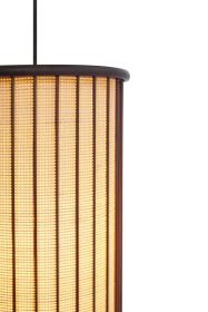 Das filigrane Gestell aus massiver Esche, edel in Nussbaum gebeizt und mit einem transparenten Lack veredelt, verleiht der Leuchte eine hochwertige und natürliche Anmutung. Feine, vertikale Elemente aus braun lackiertem Metall unterstreichen die elegante Linienführung und schaffen eine leichte, beinahe schwebende Optik.