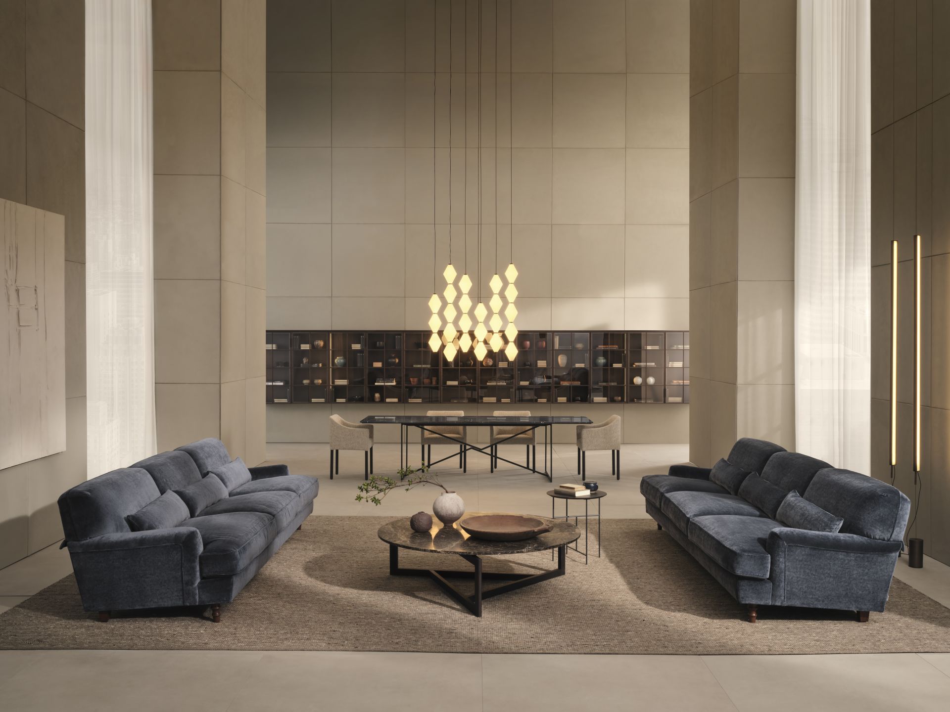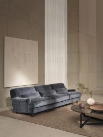Die Gänsedaunenkissen mit vollständig abnehmbaren Bezügen bieten höchsten Sitzkomfort für jedes Alter. Neben den zwei- und dreisitzigen Sofaversionen umfasst die Kollektion auch einen Sessel sowie einen passenden Hocker.