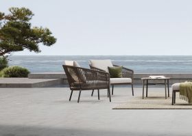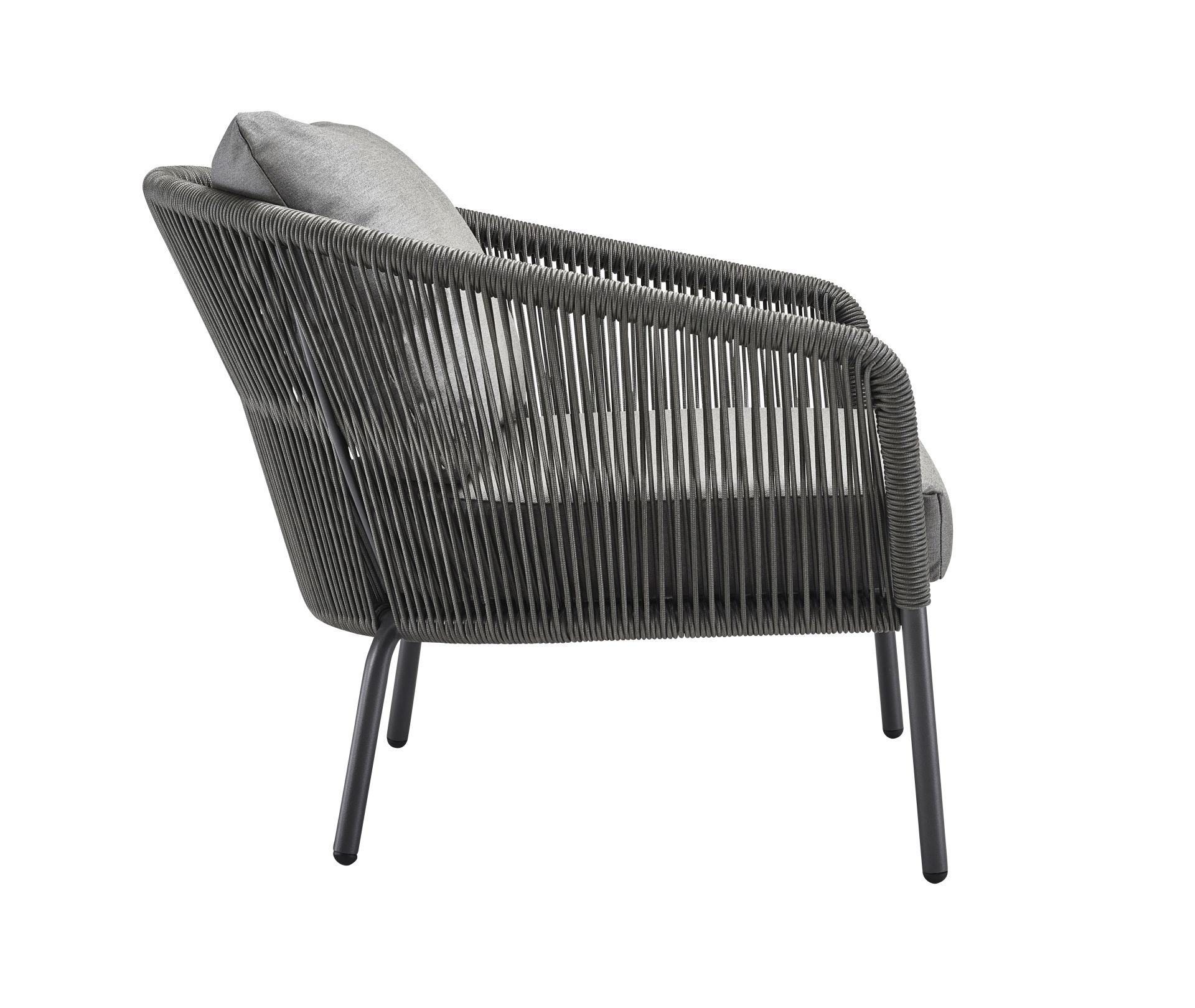 Der LOOP Lounge Sessel von SOLPURI verbindet eine grazile, weich gerundete Formgebung mit elegantem Minimalismus und hohem Sitzkomfort. Das filigrane Gestell, die charakteristische String-Flex-Bespannung und die harmonisch abgestimmte Polsterung verleihen dem Sessel eine leichte, stilvolle Ausstrahlung und machen ihn zu einer komfortablen Wahl für anspruchsvolle Outdoor-Lounge-Bereiche.