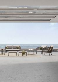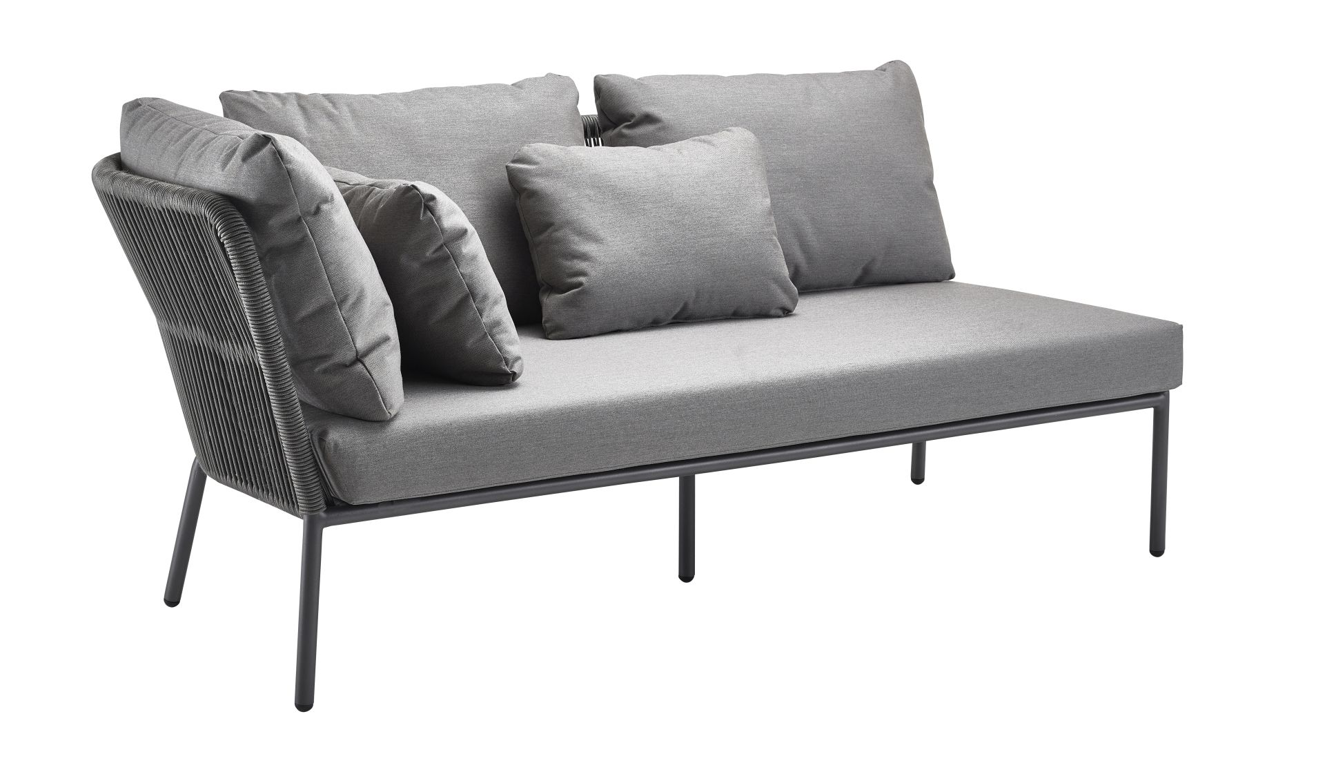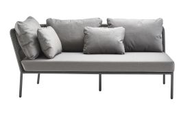 Die LOOP Recamiere rechts von SOLPURI verbindet eine grazile, weich gerundete Formgebung mit elegantem Minimalismus und hohem Sitzkomfort. Das filigrane Gestell, die charakteristische String-Flex-Bespannung und die harmonisch abgestimmten Polster verleihen dem Modul eine leichte, stilvolle Ausstrahlung und machen es zu einer komfortablen Lösung für anspruchsvolle Outdoor-Lounge-Bereiche.