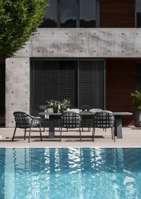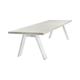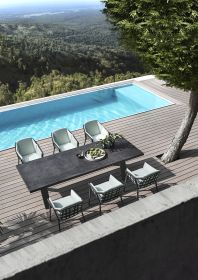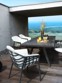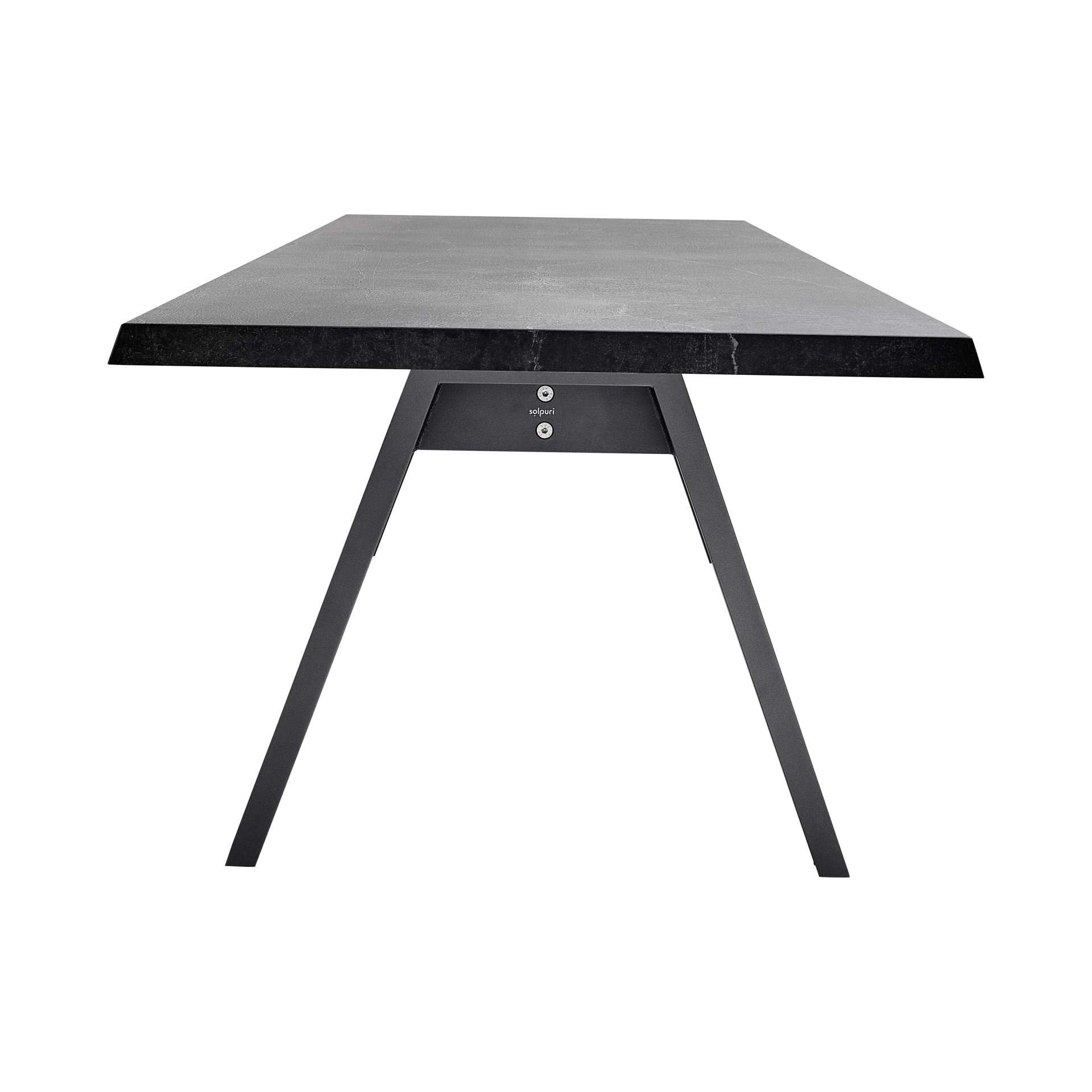 Der ROCK Dining Tisch von SOLPURI verbindet puristische Eleganz mit einer markanten, architektonischen Formensprache und hochwertiger Materialität. Die massiv wirkende Tischplatte mit abgeschrägten Kanten und die schräg gestellten Tischbeine aus Aluminium verleihen dem Tisch eine stilvoll minimalistische Ausstrahlung und machen ihn zu einer ausdrucksstarken Wahl für anspruchsvolle Outdoor-Dining-Bereiche.