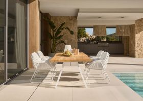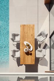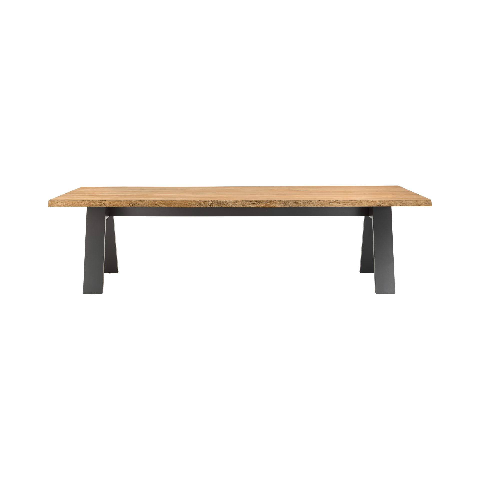 Der TIMBER Dining Tisch von SOLPURI verbindet natürliche Ursprünglichkeit mit einer klaren, modernen Formensprache und hochwertiger Materialität. Charakteristisch sind die in ihrer natürlichen Baumform belassenen Außenkanten der massiven, durchgehenden Teakplatte sowie die soliden Aluminiumbeine in markanter, umgekehrter V-Form. So entsteht ein ausdrucksstarker Tisch, der jede Outdoor-Dining-Situation mit Wärme, Individualität und zeitloser Präsenz bereichert.