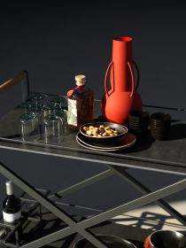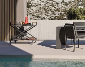 Der TROLLEY ONE Bar Trolley von SOLPURI verbindet zeitlose Eleganz mit praktischer Funktionalität und einer markanten, architektonischen Formensprache. Zwei Ablageflächen, wahlweise in Keramik oder Dekton, scheinen zwischen den X-förmigen Edelstahlrahmen zu schweben, während die rollbare Konstruktion mit arretierbaren Rollen und Teak-Holzgriffen den Trolley zu einer stilvollen und vielseitigen Lösung für anspruchsvolle Outdoor- und Hospitality-Bereiche macht.