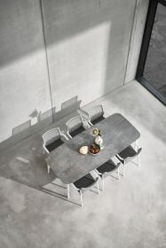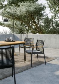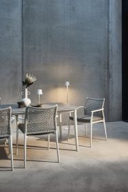 Der VERA Stapelsessel von SOLPURI verbindet filigrane Leichtigkeit mit einer eleganten, modernen Formensprache. Der schlanke Aluminiumrahmen mit verjüngten Beinen und das markante, handgearbeitete Flechtmuster aus String-Flex-Seil verleihen dem Sessel eine stilvolle, hochwertige Ausstrahlung und machen ihn zu einer komfortablen Wahl für anspruchsvolle Outdoor-Dining-Bereiche.