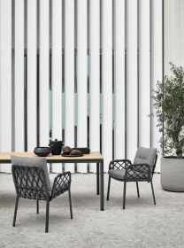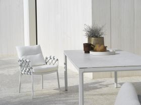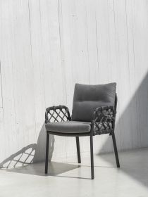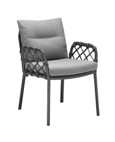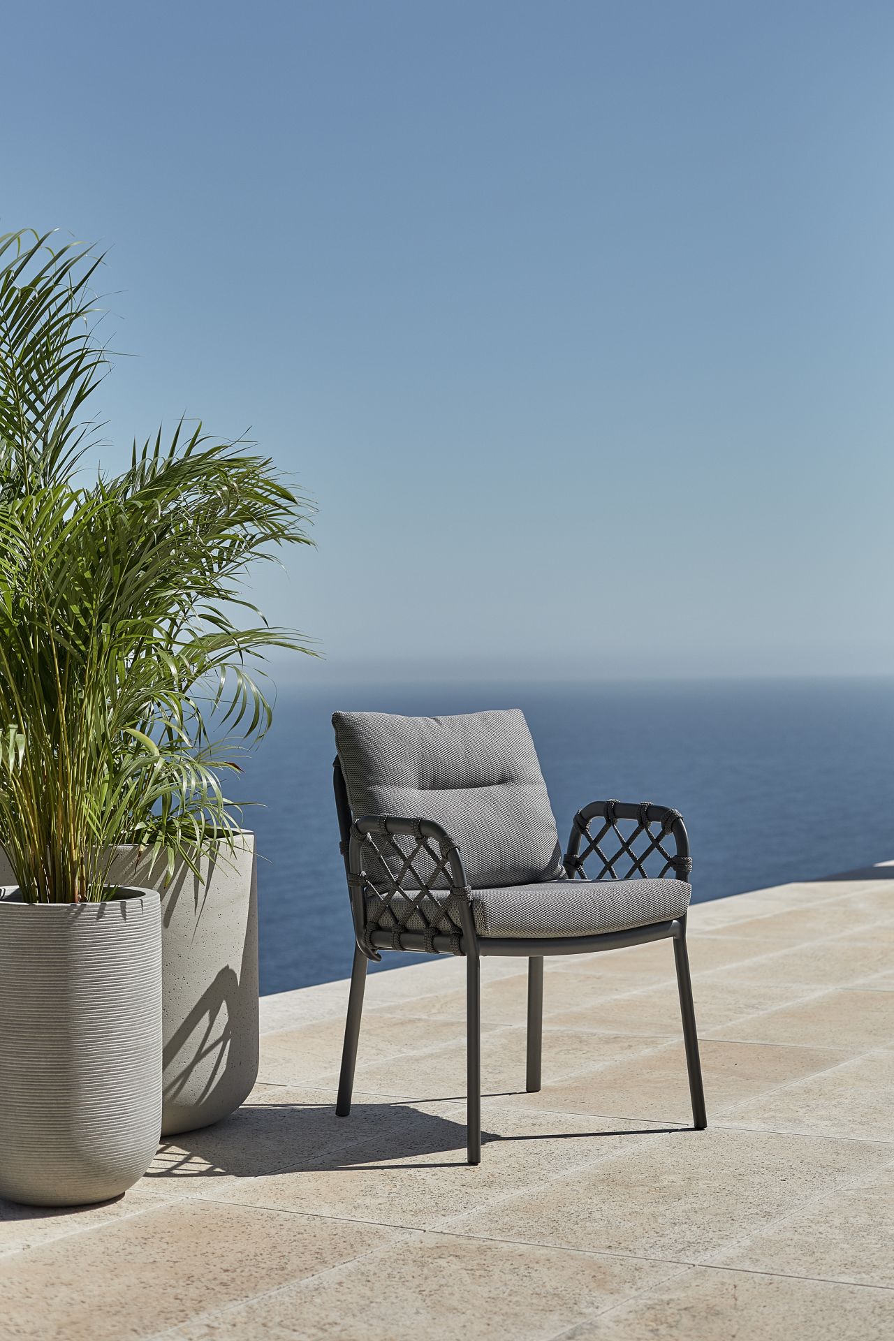 Der CARO Dining Sessel von SOLPURI überzeugt mit einer filigranen, gerundeten Silhouette und dem für die Kollektion charakteristischen offenen Rautengeflecht. Komfortable Sitz- und Rückenpolster verleihen ihm eine luxuriöse Ausstrahlung und machen ihn zu einer stilvollen Wahl für anspruchsvolle Outdoor-Dining-Bereiche.