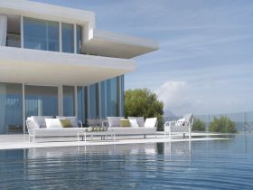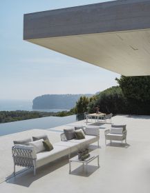 Der CARO Lounge Hocker von SOLPURI ergänzt die Kollektion mit einer gerundeten, eleganten Silhouette und dem charakteristischen filigranen String-Flex-Geflecht. Das großzügige Sitzpolster sorgt für hohen Komfort und macht den Hocker zu einer stilvollen Ergänzung für anspruchsvolle Outdoor-Lounge-Bereiche.