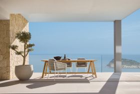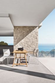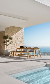 Der COUNTRY Tisch von SOLPURI verbindet zeitlose Gestaltung mit der natürlichen Ausstrahlung hochwertigen Teakholzes und bringt die Idee des modernen Landlebens in den Outdoor-Bereich. Das geradlinige Untergestell mit schräg gestellten Beinen und die breite Längsbelattung verleihen dem Tisch eine markante, zugleich harmonische Optik und machen ihn zu einer stilvollen Wahl für anspruchsvolle Dining-Bereiche im Freien.