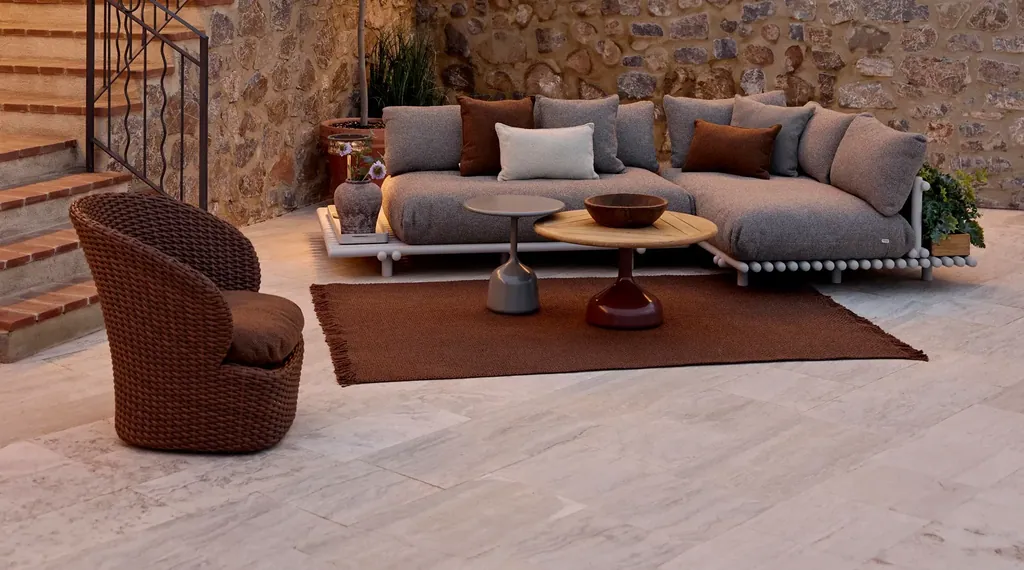 Erhältlich u. a. als rechteckiger Teppich (240 × 170 cm) und als runde Variante (Ø 200 cm), setzt KNIT stilvolle Akzente in Lounge- und Dining-Bereichen. Hochwertige Materialien, Robustheit und eine pflegeleichte Handhabung machen die Kollektion zur idealen Basis für Outdoor-Living mit Komfort.