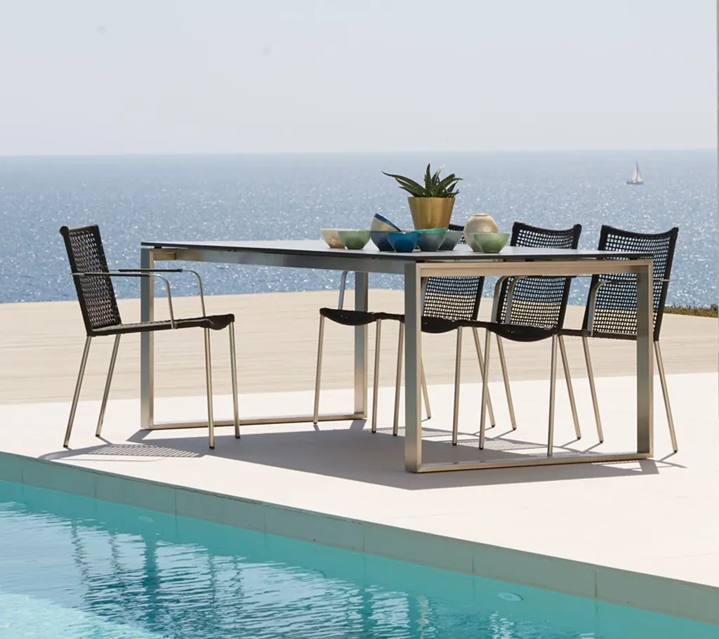 Die geflochtenen Flächen verleihen den Stühlen eine luftige Optik und hohen Komfort; der Rahmen ist aus Edelstahl gefertigt und wird mit dem innovativen Cane-line Rope kombiniert. Praktisch im Alltag: stapelbar – ideal für flexible Dining-Setups auf Terrasse, Balkon oder im Objekt.