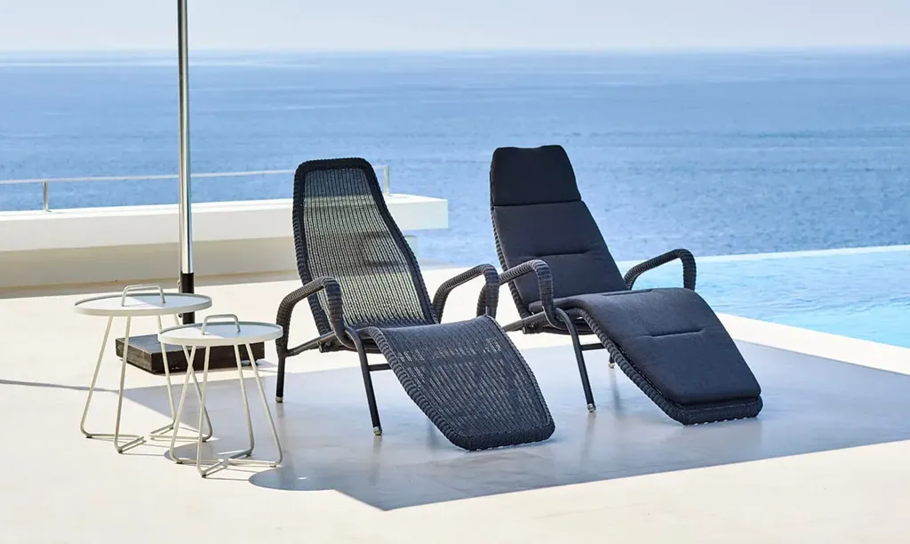 Die SUNRISE Kollektion von Cane-line verbindet das Beste aus zwei Welten: aufrecht entspannen und lesen – oder mit einem leichten Druck über die Arme sanft in die Liegeposition gleiten.