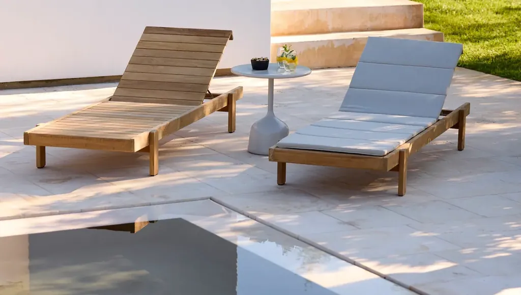 Im Zentrum steht die Vista Sonnenliege aus zertifiziertem Grade-A-Teak mit verstellbarer Rückenlehne und stapelbarer Funktion – langlebig, zeitlos und gemacht für Pool, Terrasse und Garten. Optional ergänzt das passende, großzügig gepolsterte Kissen den Komfort: wetterfest, lichtecht und dank QuickDry & Airflow nach Regen in etwa einer Stunde wieder trocken.
