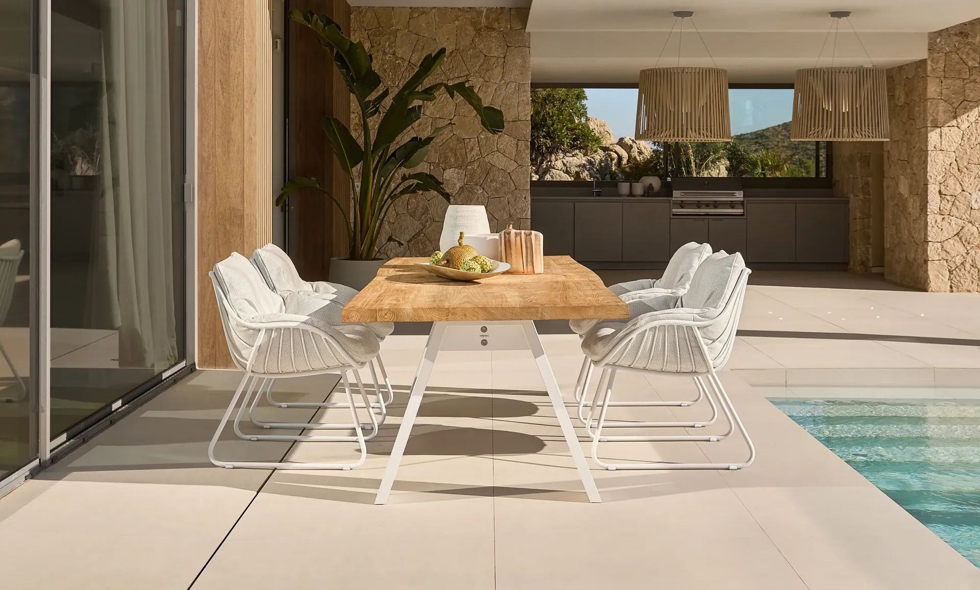 TIMBER steht für die harmonische Verbindung aus ursprünglicher Materialität, moderner Form und lebendiger Natürlichkeit – geschaffen für stilvolle Outdoor-Dining-Bereiche mit Persönlichkeit und Bestand. Die Kollektion TIMBER von Solpuri verbindet die Kraft massiven Teakholzes mit klarer, moderner Linienführung und einer authentischen, unverwechselbaren Ausstrahlung. Natürliche Kanten, individuelle Maserungen und markante Aluminiumbeine schaffen ein Tischdesign, das Wärme, Charakter und zeitlose Präsenz auf besondere Weise vereint.
