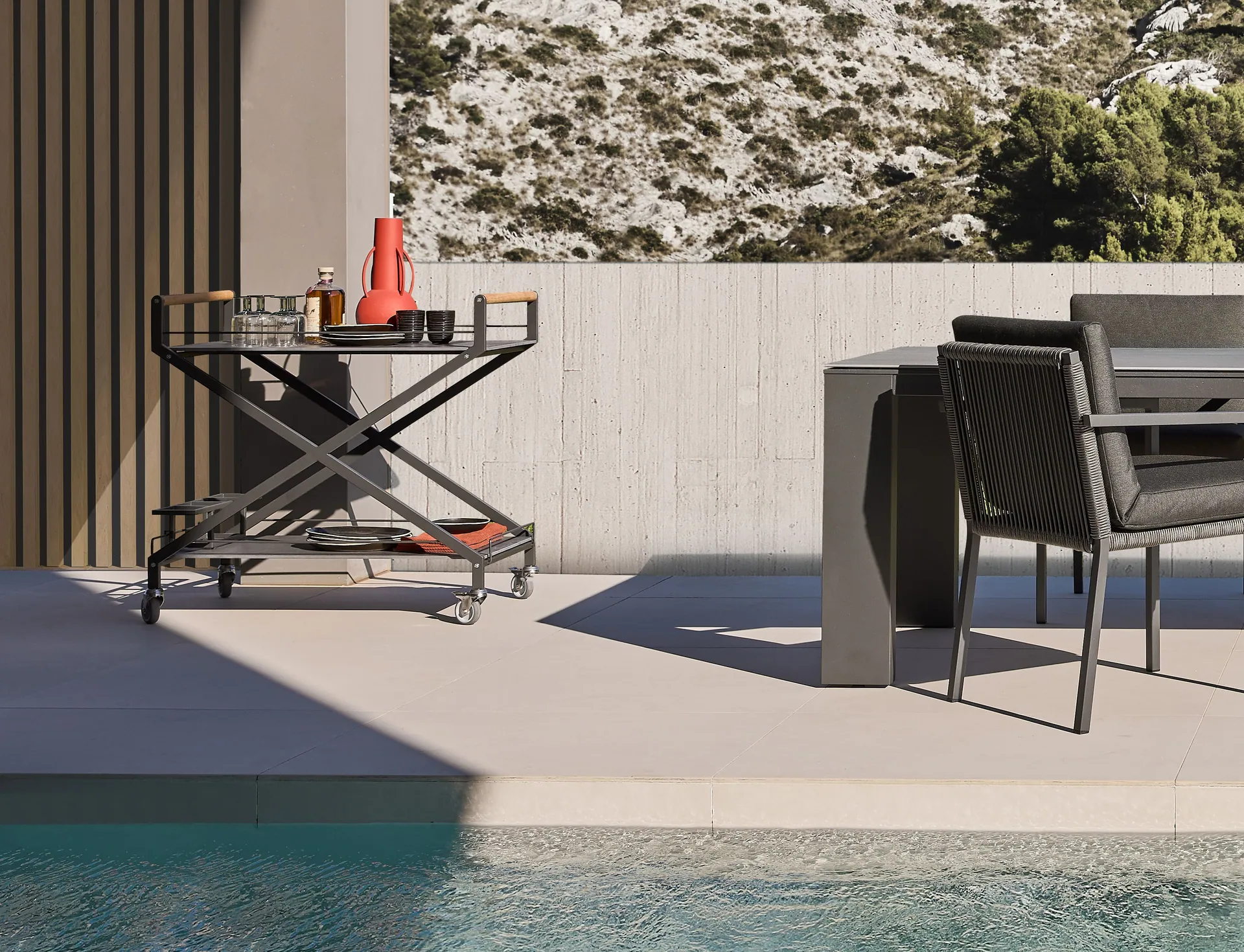 TROLLEY ONE verbindet architektonische Klarheit mit praktischer Beweglichkeit und schafft eine Lösung für Outdoor- und Hospitality-Bereiche, in denen Funktion nicht verborgen, sondern bewusst gestaltet wird.
