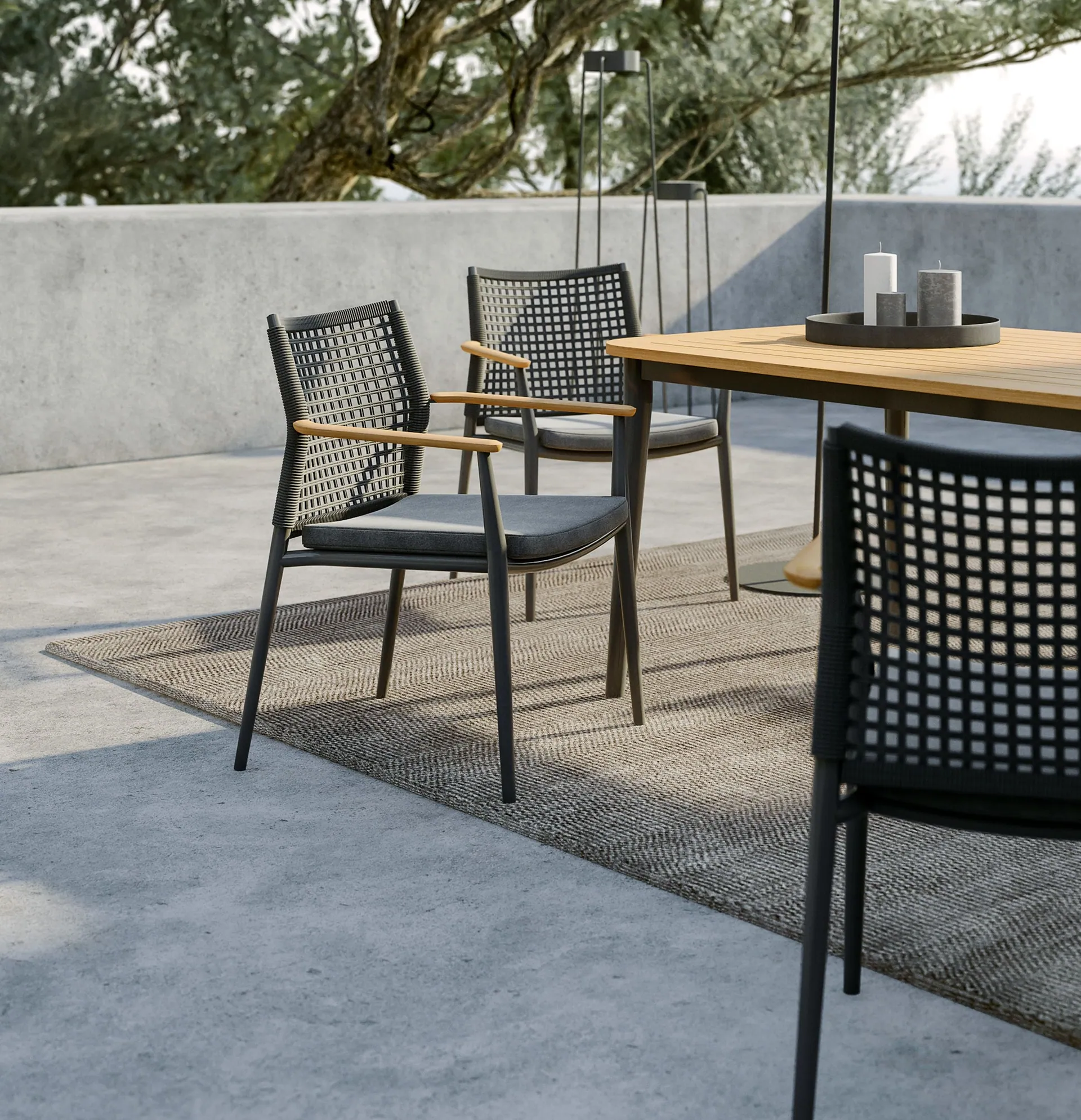VERA steht für die Verbindung aus filigraner Linienführung, handgearbeitetem Geflecht und natürlichen Materialakzenten – geschaffen für anspruchsvolle Outdoor-Bereiche mit ruhiger, hochwertiger Ausstrahlung.Die Kollektion VERA von Solpuri verbindet schlanke Proportionen mit handwerklicher Raffinesse und moderner Leichtigkeit. Der fein gezeichnete Aluminiumrahmen, das charakteristische String-Flex-Geflecht und warme Teakdetails schaffen eine stilvolle Outdoor-Ästhetik, die Eleganz, Komfort und zeitlose Wertigkeit harmonisch vereint.