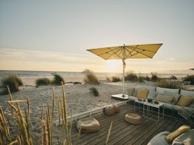 Nicht zu gross und nicht zu klein, erfüllt der FORTELLO® sämtliche Anforderungen der Hotellerie und Gastronomie: Dank seines gegenläufigen Servo-Öffnungsprinzips ist er leicht zu handhaben, lässt sich mittels seines teilbaren Masts und geringen Gewichts bequem transportieren und in Nullkommanichts wegräumen. Aufgquadratisch seiner stabilen Konstruktion hält der FORTELLO® Windgeschwindigkeiten bis zu 65 km/h stand und lässt sich auf Wunsch mit OSYRION®-Lichtausstatten. Dieses neue Modell von GLATZ sorgt nicht nur für optimalen Sonnen- und Regenschutz, sondern bietet vor allem eins: Eine ideale Fläche für Werbelogos und -schriftzüge à la couleur.