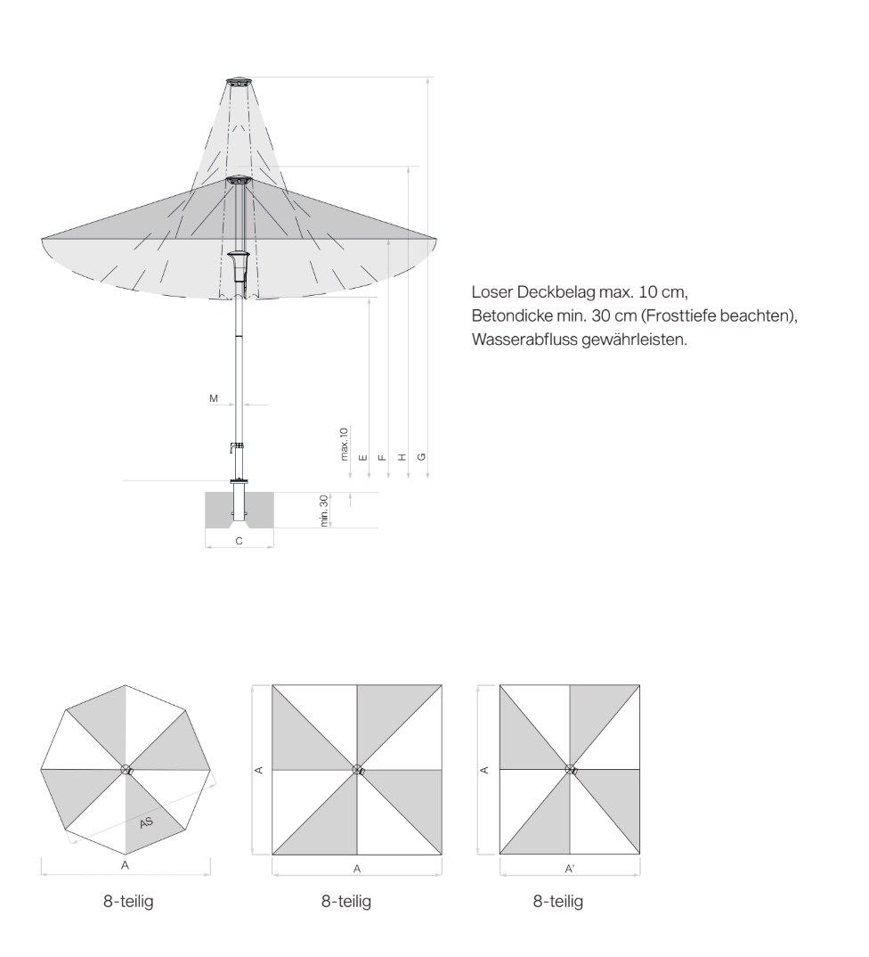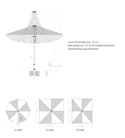 Material und Technik: Das Gestell ist aus Aluminium mit zweiteiligem profiliertem Mast. Schieber und Krone sind aus robustem Aluminium-Druckguss. Der Schirmbezug ist auswechselbar und selbstspannend, dank den flexiblen Strebenenden.