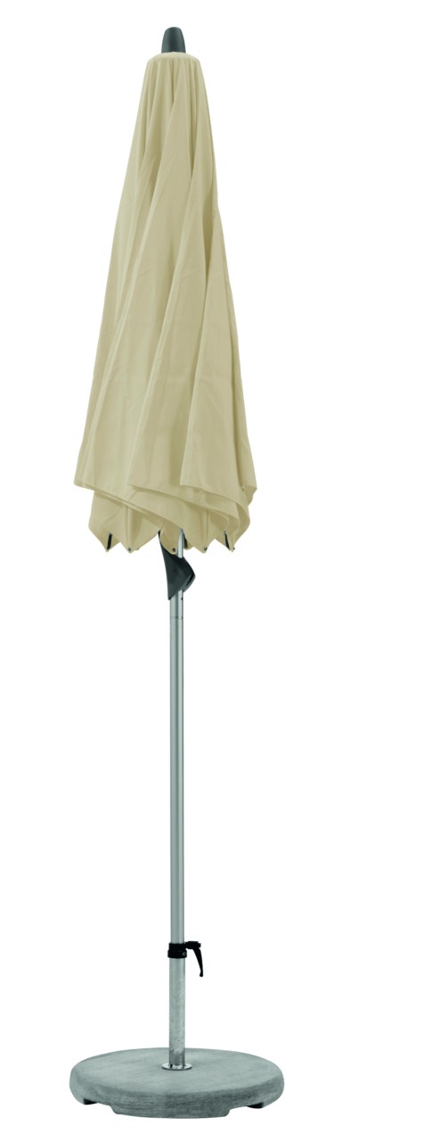 Material und Technik: Das Gestell ist aus Aluminium mit zweiteiligem profiliertem Mast. Schieber und Krone sind aus robustem Aluminium-Druckguss. Der Schirmbezug ist auswechselbar und selbstspannend, dank den flexiblen Strebenenden.